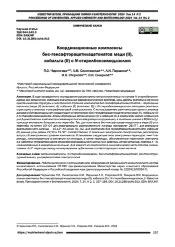 С использованием рентгеноструктурного анализа доказана бипирамидальная координация в комплексах бис-гексафторацетилацетонатов меди (II), кобальта (II) с N-стирилбензимидазолом. Атомы переходных металлов меди (II) и кобальта (II) в комплексах имеют необычную для β-дикетонатных комплексов искаженную плоско-квадратную координацию, а хелатным циклам в M(hfacac)2L присущи аномально большие углы перегиба. Так, для комплекса бис-гексафторацетилацетоната меди (II) угол перегиба по линии О3∙∙∙О4 для экваториально расположенного лиганда составляет 29,47°, для аксиально расположенного лиганда – 19,13° по линии О1∙∙∙О2. Для комплекса бис-гексафторацетилацетоната кобальта (II) данные углы равны 22,10 и 19,50° соответственно. С помощью электронной спектроскопии рассмотрен вопрос об электронном строении комплексов. Установлены следующие типы электронных переходов: π→π*-переходы, локализованные в основном на лигандах, а также переходы, обусловленные переносом электрона с р-орбитали гетероатома азота стирилбензимидазольного цикла на d-орбиталь ионов металлов, переход n→π, локализованный в имидазольном кольце. Для каждого из комплексов в длинноволновой части спектра локализованы d–d* переходы между молекулярными орбиталями соответствующего иона металла.