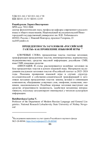 В статье рассматриваются медийные заголовки на базе прецедентных текстов в аспекте языковой игры. Материалом исследования послужили заголовки текстов «Российской газеты» за 2023-2024 годы. Показаны проявления языковой игры в случаях структурно-семантической и собственно-семантической трансформаций в заголовках исходных прецедентных текстов: замены, вставки и элиминации компонентов, обыгрывание созвучных слов, омофонии, полисемии, омонимии, окказиональности. Подобные игровые заголовки выступают как средство аттрактивности медиатекста, задействуя механизмы интерактивности, поскольку актуализируют имеющуюся у читателя культурную информацию.