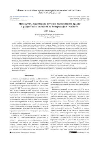 Заключение. Предложена математическая модель, которая позволяет снизить требования к используемым вычислительным средствам при разработке антенно-волноводных трактов по объему оперативной памяти и быстродействию. Реализована возможность анализа и определения характеристик антенно-волноводных трактов при помощи математической модели. Приведены этапы определения параметров антенно-волноводных трактов на основе разработанной математической модели соответствующего варианта построения, а также теоретические и экспериментальные данные, подтверждающие корректность модели антенно-волноводных трактов.