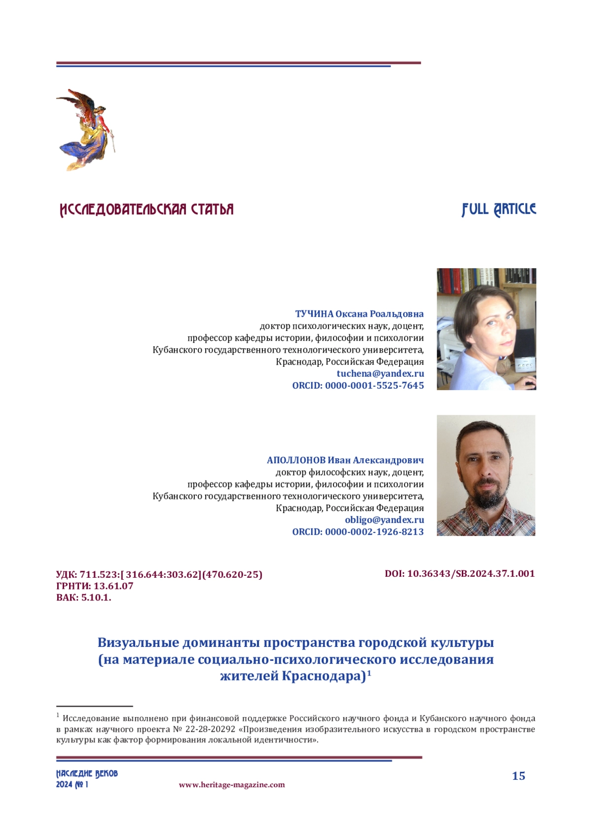 22. Тучина О. Р., Аполлонов И. А., Посметюха Л. А. Городское культурное пространство как фактор формирования локальной идентичности (на материале исследования молодежи Краснодара) // Герценовские чтения: психологические исследования в образовании. 2022. № 5. С. 439–444.