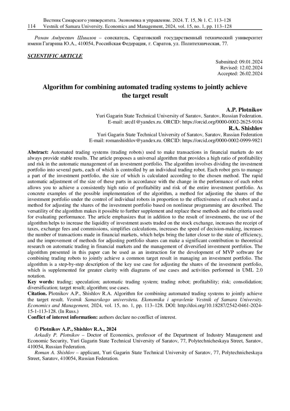 - Шишлов Р.А., Глазков В.П. Разработка методики по объединению автоматических торговых систем для совместного достижения целевого результата // Проблемы управления в социально-экономических и технических системах: сб. науч. ст. по материалам ХIII Междунар. науч. конф., г. Саратов, 06–07 апр. 2017 г. Саратов, 2017. C. 322–328. URL: https://www.elibrary.ru/item.asp?id=30265621. EDN: https://www.elibrary.ru/zmhwhl.