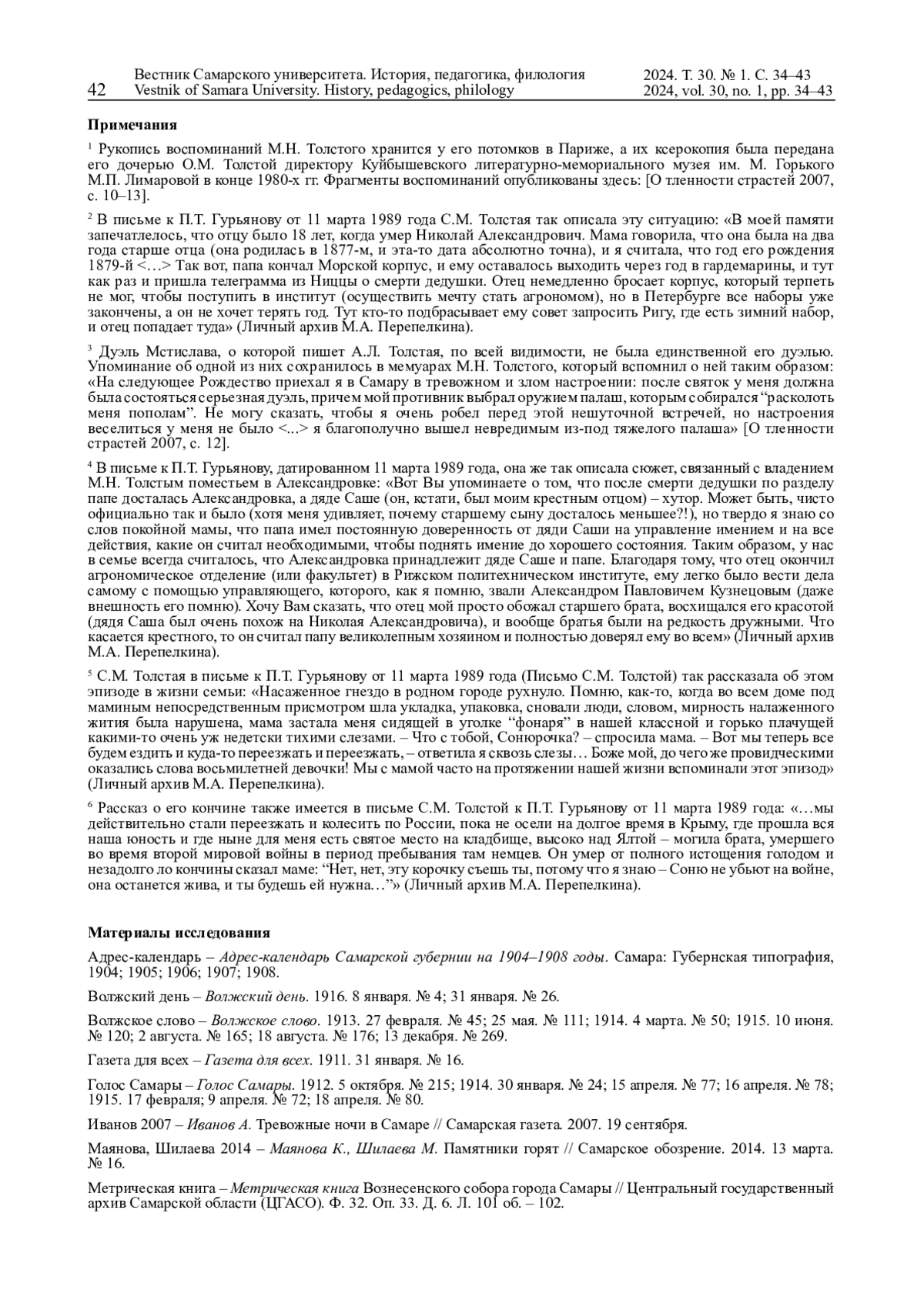 Имена А.Н. Толстого и М.Н. Толстого нельзя причислить к полностью забытым: они нет-нет, да и фигурируют в некоторых биографических исследованиях, посвященных их матери и брату – А.Л. Толстой и А.Н. Толстому [Оклянский 1982, с. 54, 62], можно их встретить в некоторых краеведческих изданиях, посвященных Самаре и самарской истории начала ХХ столетия [Историко-культурная энциклопедия… 1995, с. 89, 97], отсылки к фактам биографии А.Н. и М.Н. Толстых проникли даже на страницы художественных произведений [Толстая 2022, с. 45–47]. Однако никакой полной биографии сыновей одной самарской писательницы и братьев другого – выдающегося – самарца как не было, так и нет, а их отдельные факты и события остаются разбросанными и раскиданными по газетным публикациям и разрозненным архивным документам, лишая нас возможности целостного взгляда на две очень интересные личности, сыгравшие заметную роль как в истории Самары, так и в личных историях уже названных самарцев, прямо или косвенно связанных с М.Н. и А.Н. Толстыми на протяжении длительного времени, знавших или стремившихся знать, как складывались их судьбы и что с ними происходило на разных этапах исторического развития страны, в которой они жили и вместе с которой оказывались в самых разных ситуациях и обстоятельствах. Настоящая статья является первой – пробной – попыткой такие биографии создать, для чего мы привлекли архивы, публикации в газетах и других изданиях, мемуары и некоторые другие источники, одни из которых дополняют другие или друг другу противоречат, но в итоге складываются в нечто, что может быть названо опытом реконструкции биографий А.Н. и М.Н. Толстых.