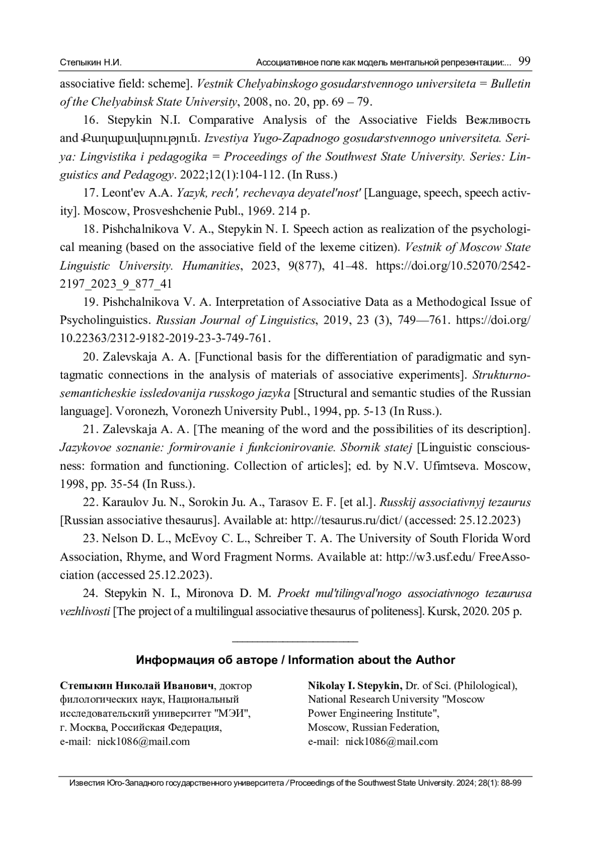 Методы. Построение ассоциативного поля основано на данных свободного ассоциативного эксперимента, представленных в русском ассоциативном тезаурусе и словаре ассоциативных норм университета Южной Флориды. Моделирование ассоциативного поля предполагает распределение ассоциатов по характеру предикации для выделения понятийных реакций, ассоциатов-представлений, эмоционально-оценочных и операциональных реакций. Установленное соотношение типов ассоциатов позволяет выявить доминирование когнитивных, эмотивных или языковых опор при продуцировании речевого действия.