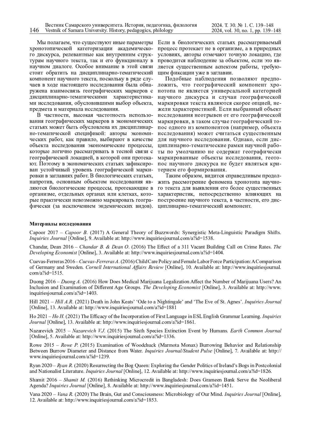 ЦЕРКОВНОВ С. А., СВОЙКИН К. Б. ГЕОГРАФИЧЕСКИЙ КОМПОНЕНТ ХРОНОТОПА АНГЛОЯЗЫЧНОГО НАУЧНОГО ДИСКУРСА И ФОРМЫ ЕГО РЕПРЕЗЕНТАЦИИ // ВЕСТНИК САМАРСКОГО УНИВЕРСИТЕТА. ИСТОРИЯ, ПЕДАГОГИКА, ФИЛОЛОГИЯ. 2024. Т. 30 № 1