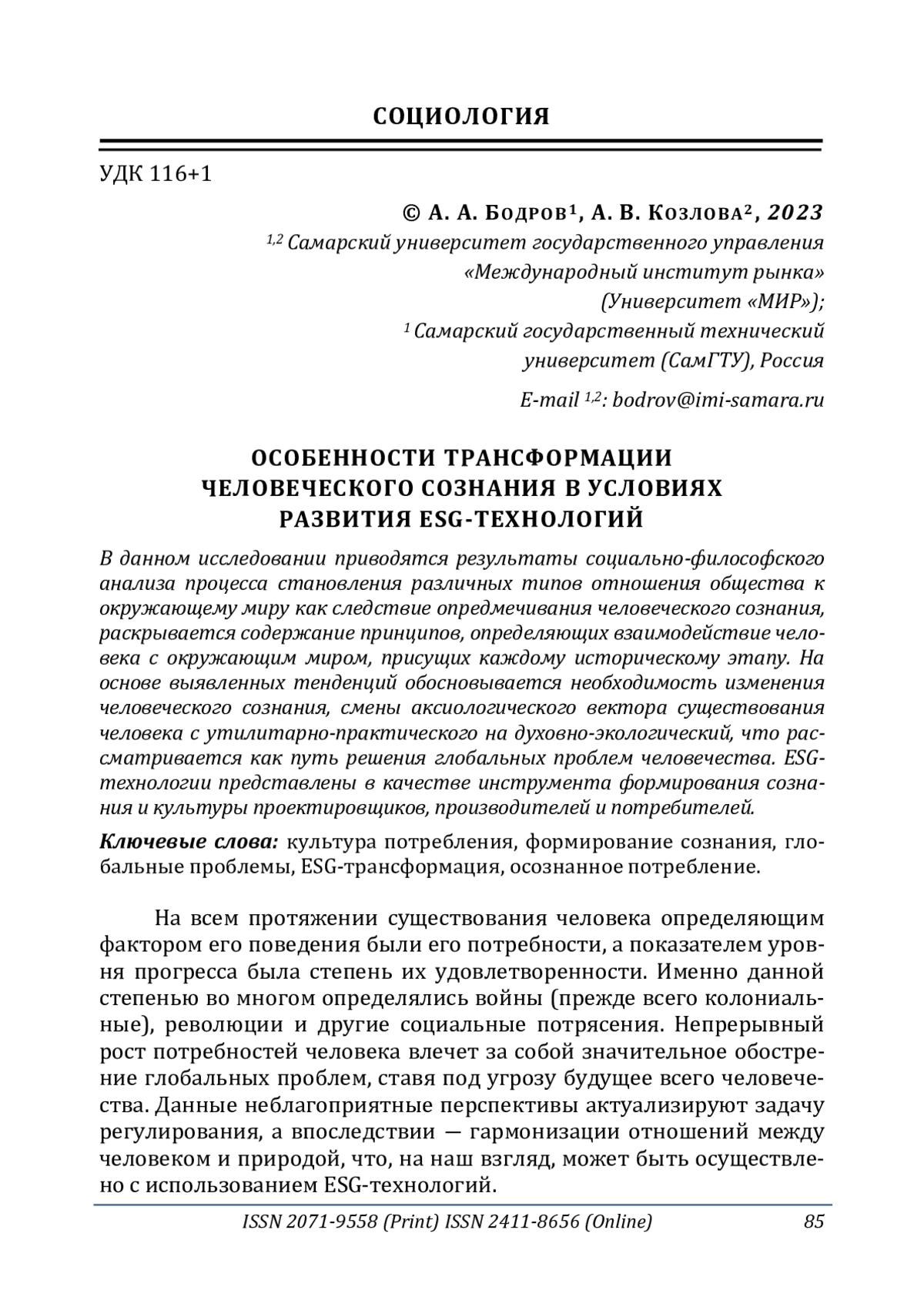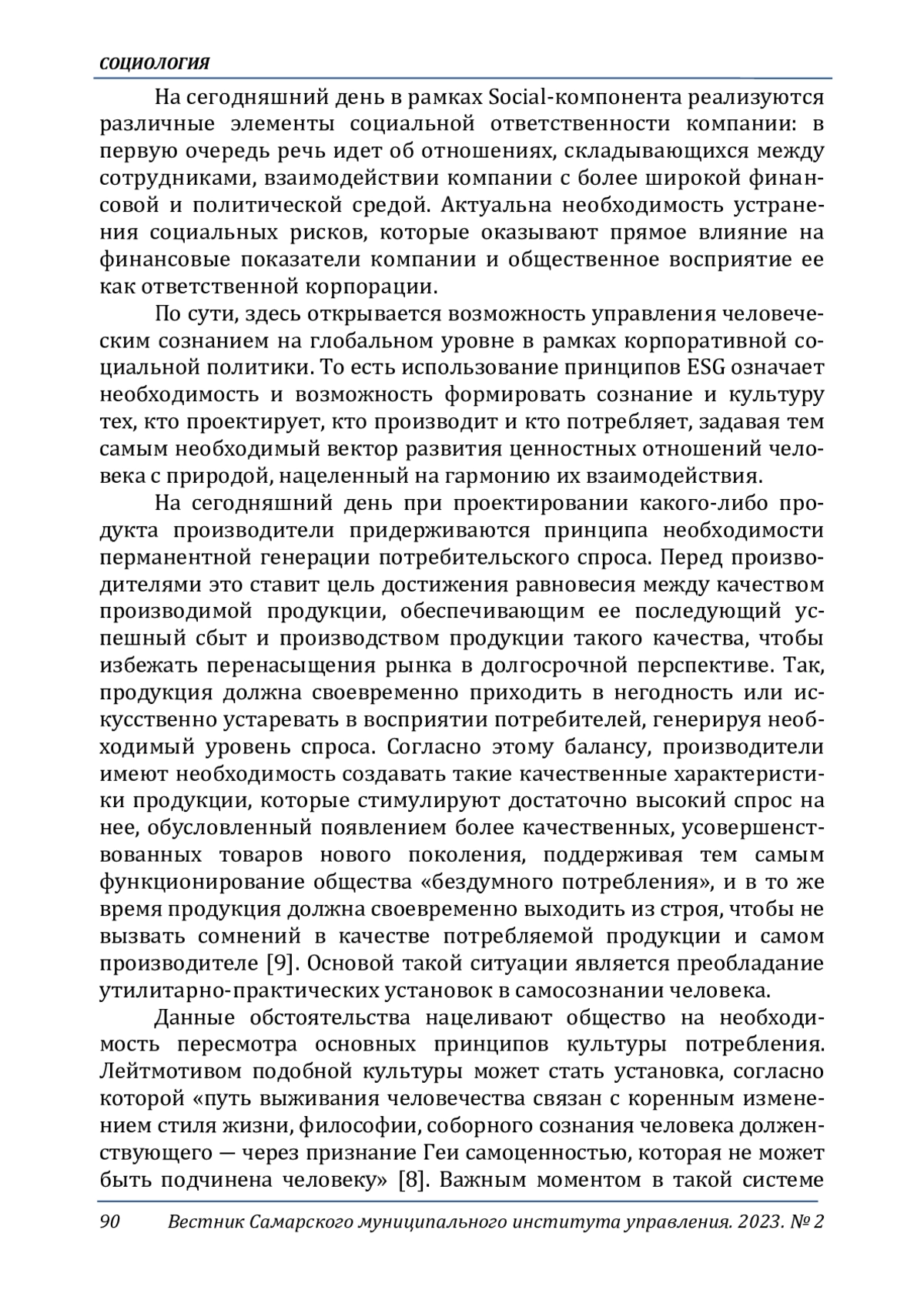 В данном исследовании приводятся результаты социально-философского анализа процесса становления различных типов отношения общества к окружающему миру как следствие опредмечивания человеческого сознания, раскрывается содержание принципов, определяющих взаимодействие человека с окружающим миром, присущих каждому историческому этапу. На основе выявленных тенденций обосновывается необходимость изменения человеческого сознания, смены аксиологического вектора существования человека с утилитарно-практического на духовно-экологический, что рассматривается как путь решения глобальных проблем человечества. ESG-технологии представлены в качестве инструмента формирования сознания и культуры проектировщиков, производителей и потребителей.