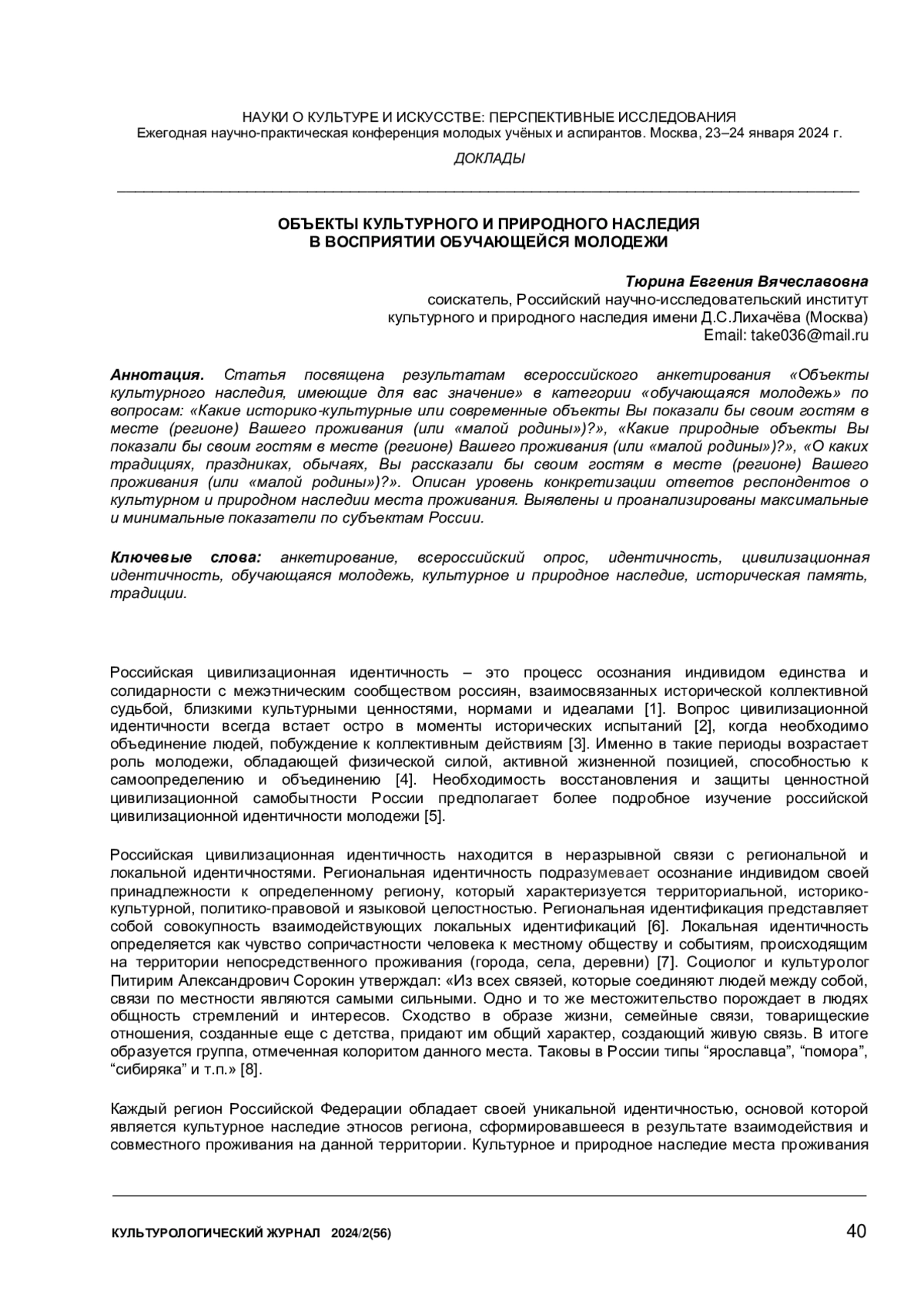 [9] Путрик, Ю.С., Тюрина, Е. В. Пути актуализации объектов культурного наследия средствами туризма и социокультурного проектирования. – DOI 10.34685/HI.2023.82.47.001. – Текст: электронный // Журнал Института Наследия. – 2023. – № 4. – С. 8-12. – URL: http://nasledie-journal.ru/ru/journals/617.html (дата обращения: 02.01.2024).