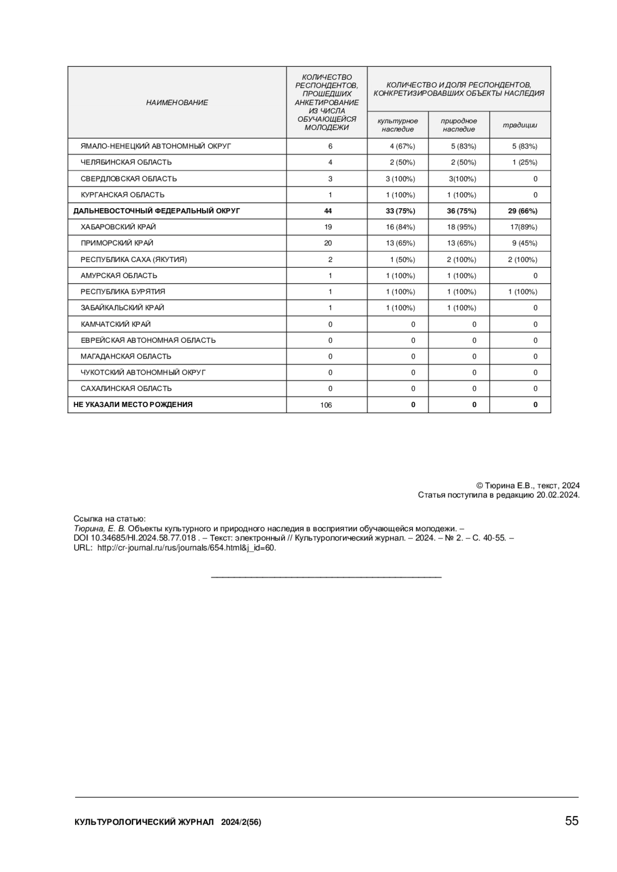 Статья посвящена результатам всероссийского анкетирования «Объекты культурного наследия, имеющие для вас значение» в категории «обучающаяся молодежь» по вопросам: «Какие историко-культурные или современные объекты Вы показали бы своим гостям в месте (регионе) Вашего проживания (или «малой родины»)?», «Какие природные объекты Вы показали бы своим гостям в месте (регионе) Вашего проживания (или «малой родины»)?», «О каких традициях, праздниках, обычаях, Вы рассказали бы своим гостям в месте (регионе) Вашего проживания (или «малой родины»)?». Описан уровень конкретизации ответов респондентов о культурном и природном наследии места проживания. Выявлены и проанализированы максимальные и минимальные показатели по субъектам России.