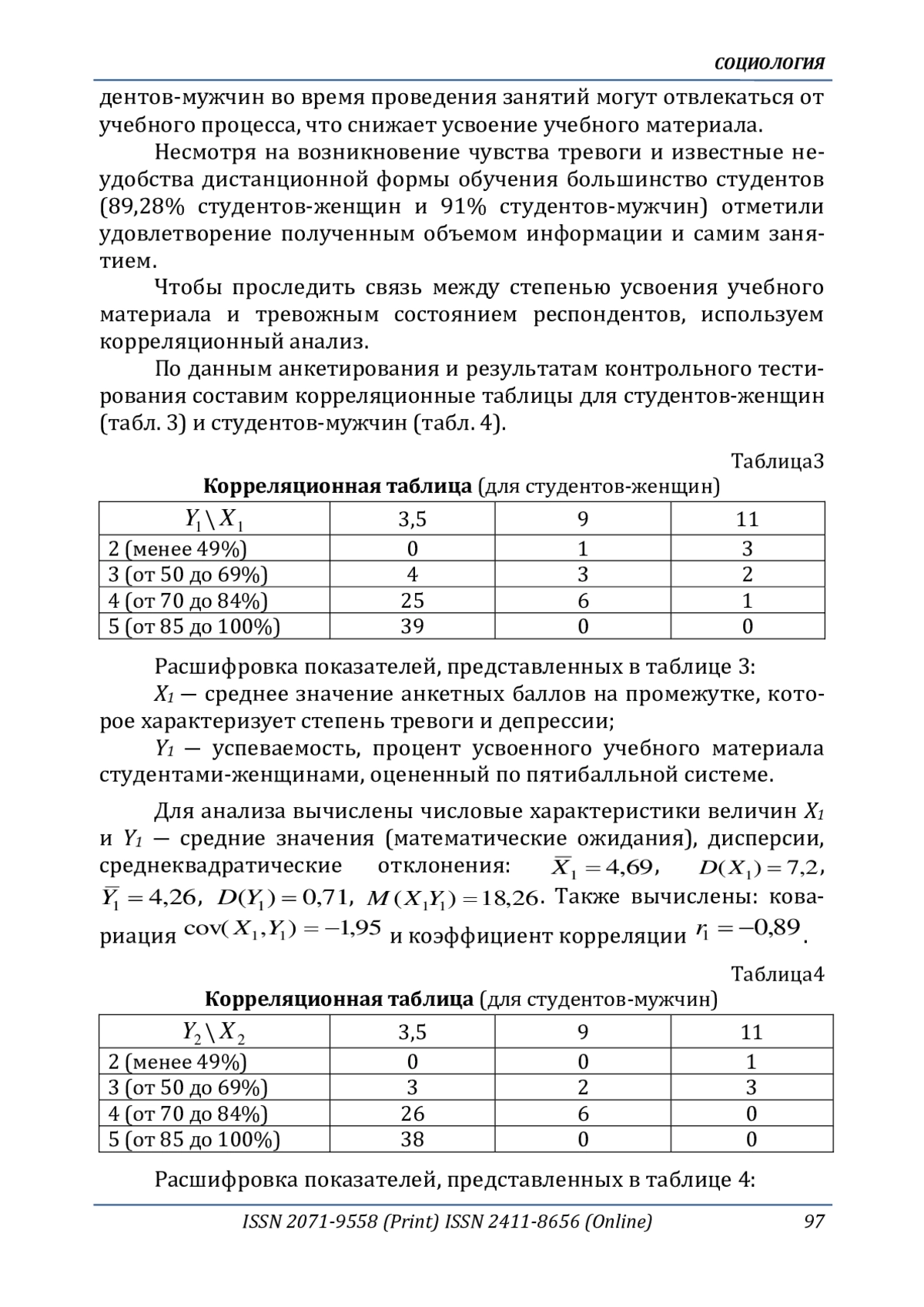 В статье рассматривается одна из моделей изучения социального пространства студентов-женщин и студентов-мужчин, возникающего при дистанционном проведении воспитательно-образовательного процесса, с включенными в него элементами цифровых технологий и ресурсов Интернета в проведении занятий и экзаменов. Проведена оценка возникающей тревожной обстановки и возникающего от этого снижения усвояемости учебного материала с помощью специально адаптированной для этих целей анкеты «Госпитальной шкалы тревоги и депрессии. Hospital Anxiety and Depression Scale (HADS)»; выявлены гендерные отличия. Анкетирование проведено среди 162 студентов, из которых 84 (51,85%) - студентов-женщин и 78 (48,77%) - студентов-мужчин 1-2 курсов Самарского государственного технического университета (СамГТУ) и студентов Самарского университета государственного управления «Международный институт рынка» (Университета «МИР»), прошедших промежуточную аттестацию.