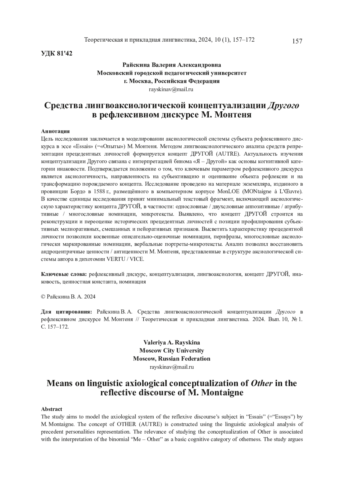 Цель исследования заключается в моделировании аксиологической системы субъекта рефлексивного дискурса в эссе «Essais» (=«Опыты») М. Монтеня. Методом лингвоаксиологического анализа средств репрезентации прецедентных личностей формируется концепт ДРУГОЙ (AUTRE). Актуальность изучения концептуализации Другого связана с интерпретацией бинома «Я - Другой» как основы когнитивной категории инаковости. Подтверждается положение о том, что ключевым параметром рефлексивного дискурса является аксиологичность, направленность на субъективацию и оценивание объекта рефлексии и на трансформацию порождаемого концепта. Исследование проведено на материале экземпляра, изданного в провинции Бордо в 1588 г., размещённого в компьютерном корпусе MonLOE (MONtaigne à L’Œuvre). В качестве единицы исследования принят минимальный текстовый фрагмент, включающий аксиологическую характеристику концепта ДРУГОЙ, в частности: однословные / двухсловные аппозитивные / атрибутивные / многословные номинации, микротексты. Выявлено, что концепт ДРУГОЙ строится на реконструкции и переоценке исторических прецедентных личностей с позиции профилирования субъективных мелиоративных, смешанных и пейоративных признаков. Высветить характеристику прецедентной личности позволили косвенные описательно-оценочные номинации, перифразы, многословные аксиологически маркированные номинации, вербальные портреты-микротексты. Анализ позволил восстановить андроцентричные ценности / антиценности М. Монтеня, представленные в структуре аксиологической системы автора в дихотомии VERTU / VICE.