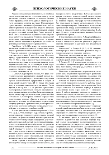 Рассматривается проблема копинг-поведения, которая в основных своих чертах была сформулирована в 1980 г. психологами Р. Лазарус и С. Фолькман, и стала продолжением развития учения о стрессе Г. Селье. В отечественной психологии теория копинг-поведения была очень популярна в так называемые трудные годы (1990 начало «нулевых»). В то время наша страны боролась с терроризмом, поэтому интерес к копинг-поведению был вполне понятен. Затем в «более спокойное» десятилетие об этой теории стали вспоминать все реже и реже. В настоящее время против нашей страны ведется необъявленная война со стороны всего, так называемого, западного мира. Против нас воюет 51 государство. Активное участие в СВО, в соответствии с законодательством Российской Федерации, принимают и сотрудники органов внутренних дел [8; 9; 10]. В этой связи теория копинг-поведения сотрудников ОВД снова становится актуальной.