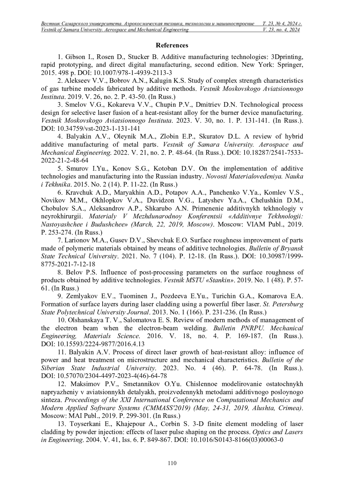 3. Смелов В.Г., Кокарева В.В., Чупин П.В., Дмитриев Д.Н. Проектирование технологического процесса селективного лазерного сплавления жаропрочного сплава для изготовления горелочного устройства // Вестник Московского авиационного института. 2023. Т. 30, № 1. С. 131-141. DOI: 10.34759/vst-2023-1-131-141 EDN: IZXAJU ст