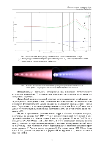 Представлены предварительные результаты разработки и исследовательских испытаний камеры ракетного двигателя с тягой 100 Н на компонентах топлива газообразный кислород - газообразный водород, предназначенного для использования в качестве маршевого двигателя малого разгонного блока для вывода полезной нагрузки массой до 150 кг на целевые орбиты. Основными особенностями камеры двигателя являются изготовление методом селективного лазерного плавления из порошка стали 12Х18Н10Т и её регенеративное охлаждение газообразным водородом. Расчётно и экспериментально подтверждена возможность регенеративного охлаждения камеры на номинальном режиме. Приведены текущие результаты разработки методики оптической регистрации процесса выноса конструкционного материала из камеры в ходе испытаний с помощью различных светофильтров. Показано, что имеется корреляция яркости полученных кадров с расходом водорода. Также показано, что догорание выносимых частиц материала в отличие от двигателей больших тяг происходит в основном в хвосте струи.