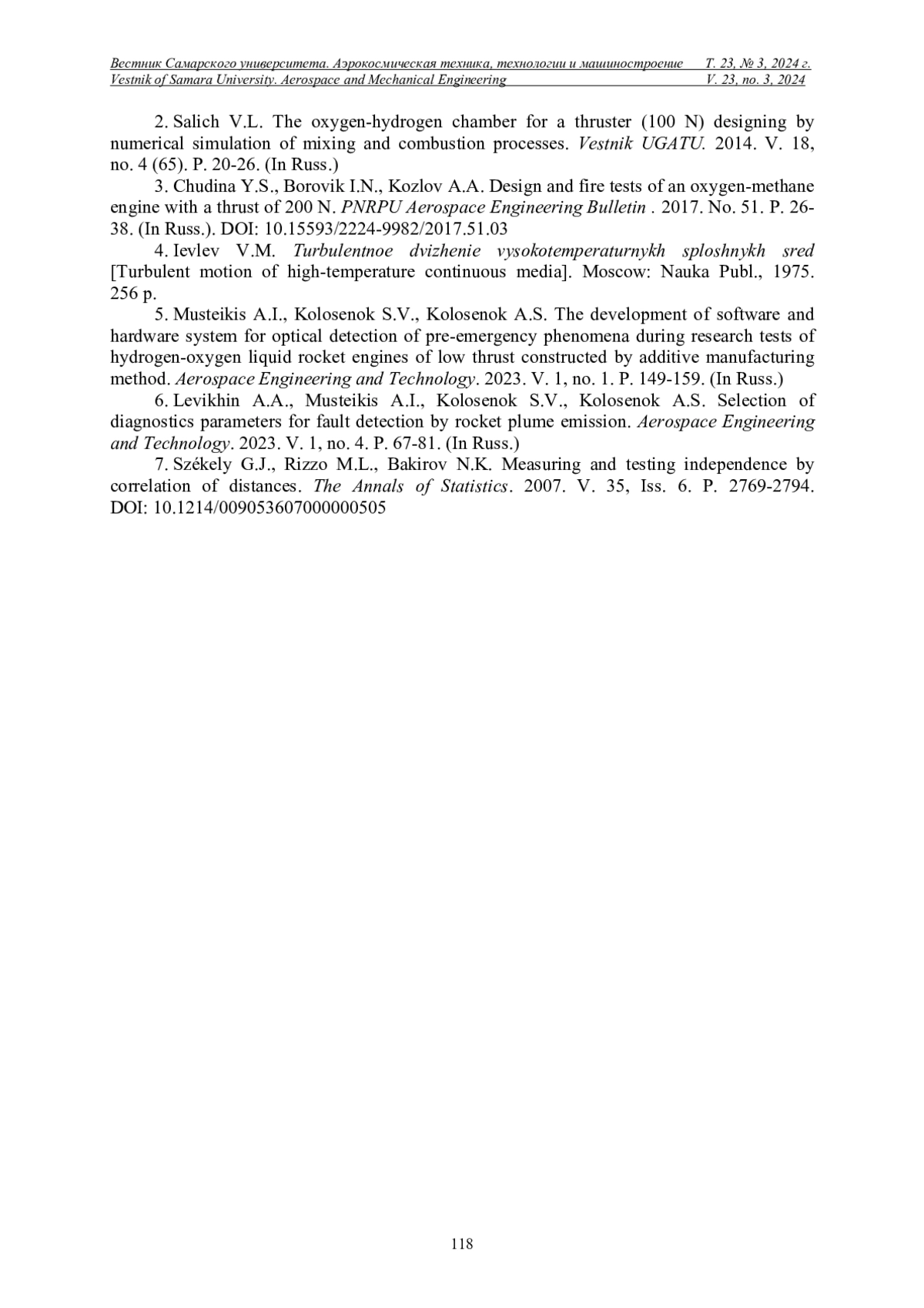 6. Левихин А.А., Мустейкис А.И., Колосенок С.В., Колосенок А.С. Выбор диагностических параметров для обнаружения неисправности по излучению факела ракетного двигателя // Аэрокосмическая техника и технологии. 2023. Т. 1, № 4. С. 67- 81. EDN: JHILPV