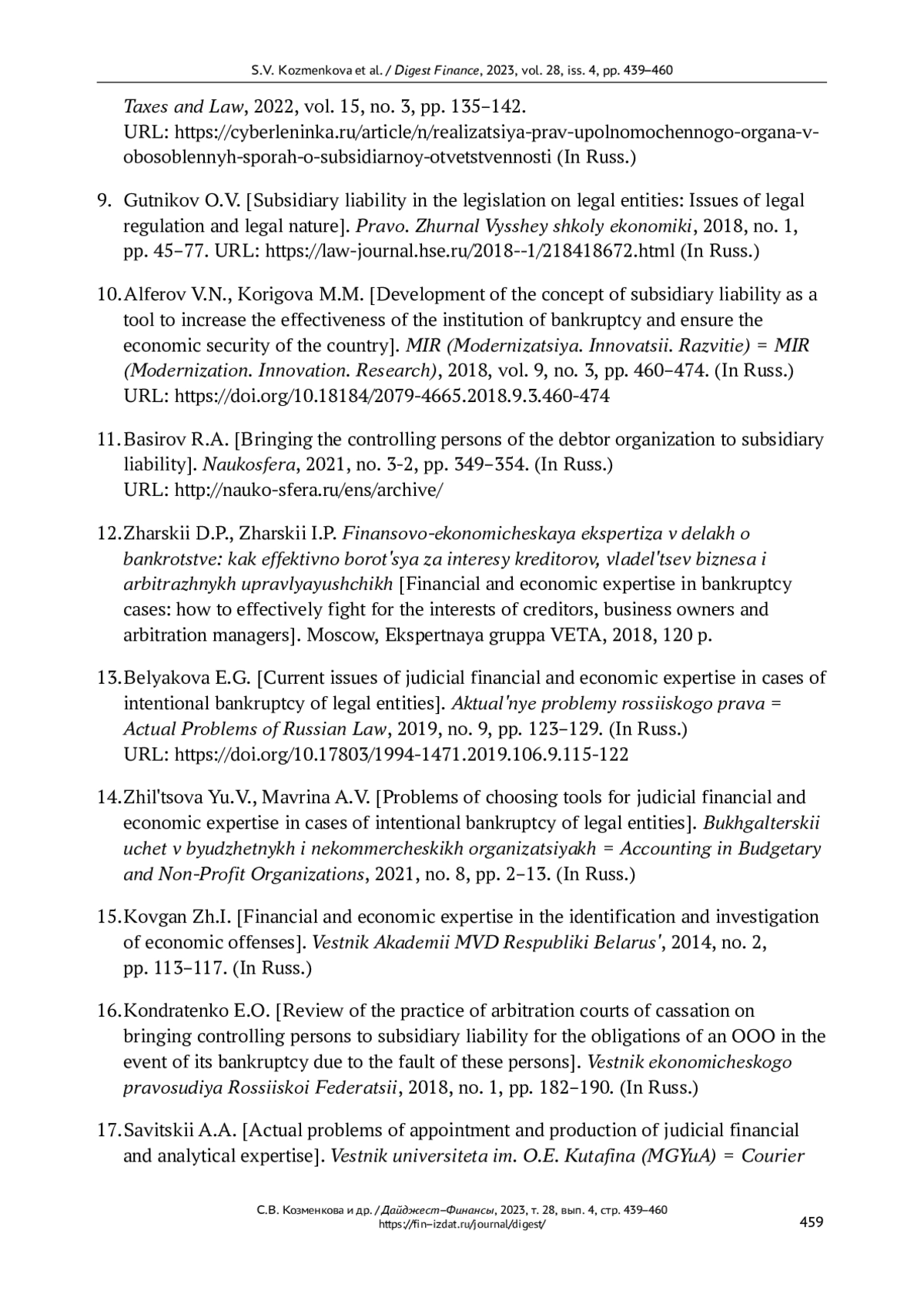 14. Жильцова Ю. В., Маврина А. В. Проблемы выбора инструментария судебной финансово-экономической экспертизы по делам о преднамеренном банкротстве юридических лиц // Бухгалтерский учет в бюджетных и некоммерческих организациях. 2021. № 8. С. 2-13. EDN: AUBZWA