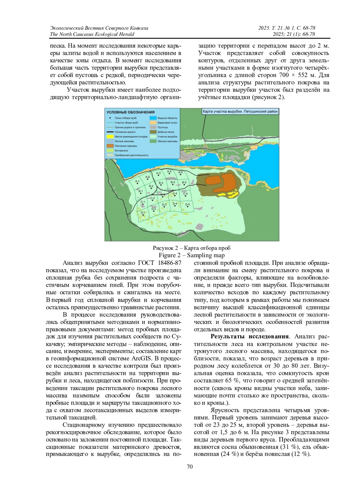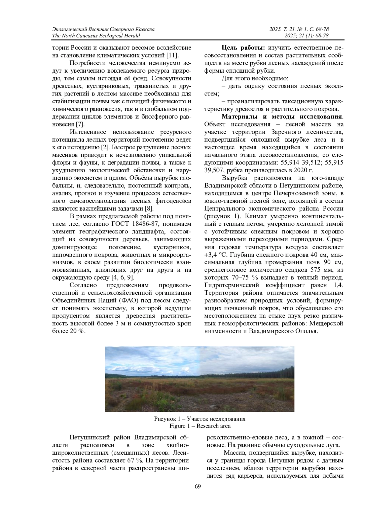 На территории Владимирской области изучали особенности восстановления растительности на ранних стадиях развития на месте рубки в Петушинском районе, что позволило дать оценку распределения разновозрастных и сложных древостоев и травянистой растительности на изучаемой территории. С применением методов, принятых в лесной таксации, в границах рубки пересчитаны растительные формации и определены изменения видового разнообразия растений фитоценозов. Установлено, что активно поселяется берёза повислая ( Betula pendula ), липа мелколистная ( Tilia cordata ), рябина обыкновенная ( Sorbus aucuparia ), сосна обыкновенная ( Pinus sylvestris ). Ключевыми растениями напочвенного покрова на местах рубки, являются растения-эдификаторы, играющие ведущую роль в сложении структуры и функционировании экосистемы, являясь также основными продуцентами фитоценозов.