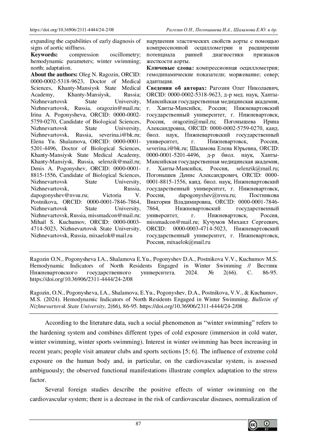 According to the literature data, such a social phenomenon as “winter swimming” refers to the hardening system and combines different types of cold exposure (immersion in cold water, winter swimming, winter sports swimming). Interest in winter swimming has been increasing in recent years; people visit amateur clubs and sports sections [5; 6]. The influence of extreme cold exposure on the human body and, in particular, on the cardiovascular system, is assessed ambiguously; the observed functional manifestations illustrate complex adaptation to the stress factor.