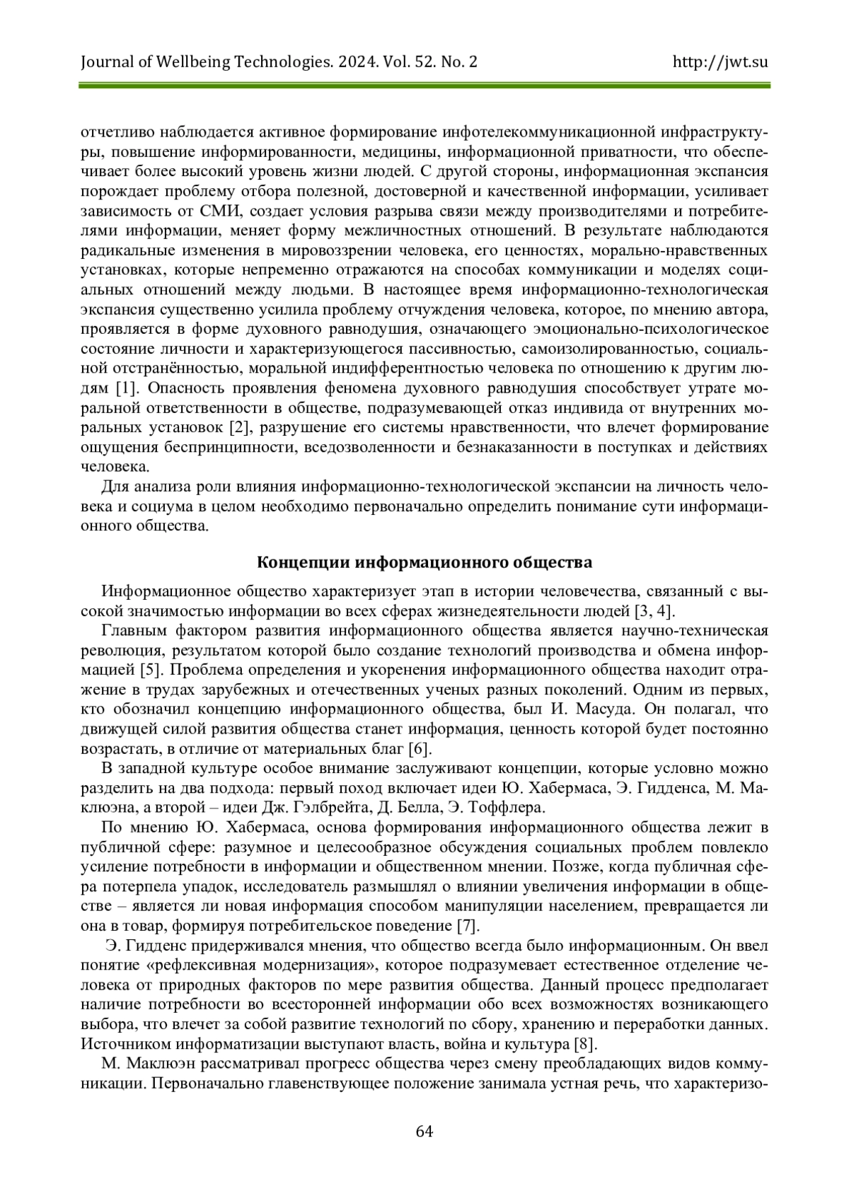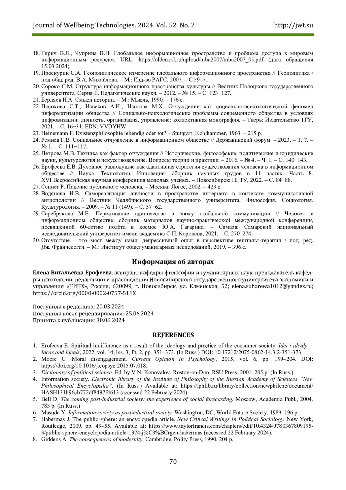 26. Ерофеева Е.В. Духовное равнодушие как адаптивная стратегия существования человека в информационном обществе // Наука. Технологии. Инновации: сборник научных трудов в 11 частях. Часть 8. XVI Всероссийская научная конференция молодых ученых. - Новосибирск: НГТУ, 2022. - С. 84-88. EDN: WTHBSV