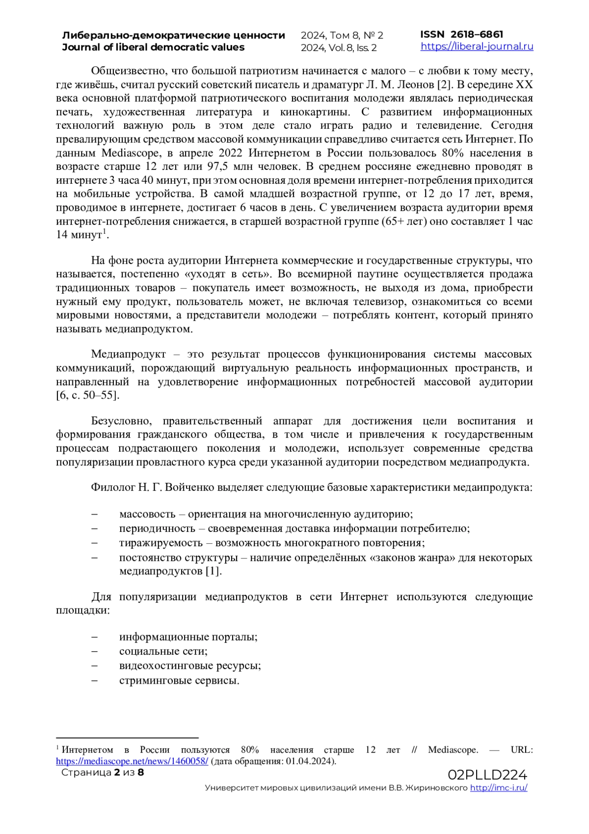 Общеизвестно, что большой патриотизм начинается с малого – с любви к тому месту, где живёшь, считал русский советский писатель и драматург Л. М. Леонов [2]. В середине XX века основной платформой патриотического воспитания молодежи являлась периодическая печать, художественная литература и кинокартины. С развитием информационных технологий важную роль в этом деле стало играть радио и телевидение. Сегодня превалирующим средством массовой коммуникации справедливо считается сеть Интернет. По данным Mediascope, в апреле 2022 Интернетом в России пользовалось 80% населения в возрасте старше 12 лет или 97,5 млн человек. В среднем россияне ежедневно проводят в интернете 3 часа 40 минут, при этом основная доля времени интернет-потребления приходится на мобильные устройства. В самой младшей возрастной группе, от 12 до 17 лет, время, проводимое в интернете, достигает 6 часов в день. С увеличением возраста аудитории время интернет-потребления снижается, в старшей возрастной группе (65+ лет) оно составляет 1 час 14 минут1.