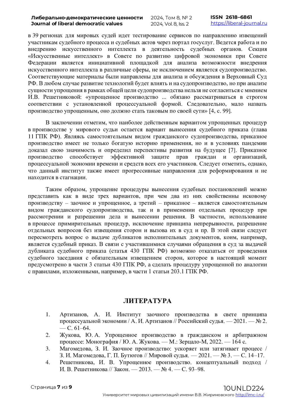 1. Артизанов, А. И. Институт заочного производства в свете принципа процессуальной экономии / А. И. Артизанов // Российский судья. — 2021. — № 2. — С. 61–64.