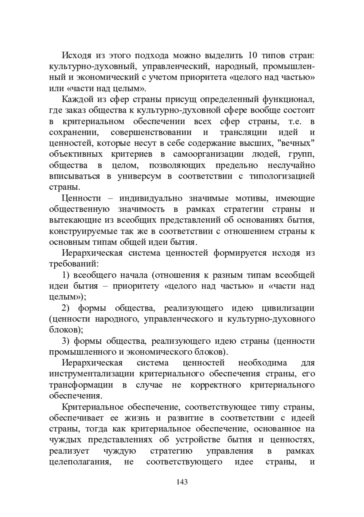 Каждой из сфер страны присущ определенный функционал, где заказ общества к культурно-духовной сфере вообще состоит в критериальном обеспечении всех сфер страны, т. е. в сохранении, совершенствовании и трансляции идей и ценностей, которые несут в себе содержание высших, “вечных” объективных критериев в самоорганизации людей, групп, общества в целом, позволяющих предельно неслучайно вписываться в универсум в соответствии с типологизацией страны.