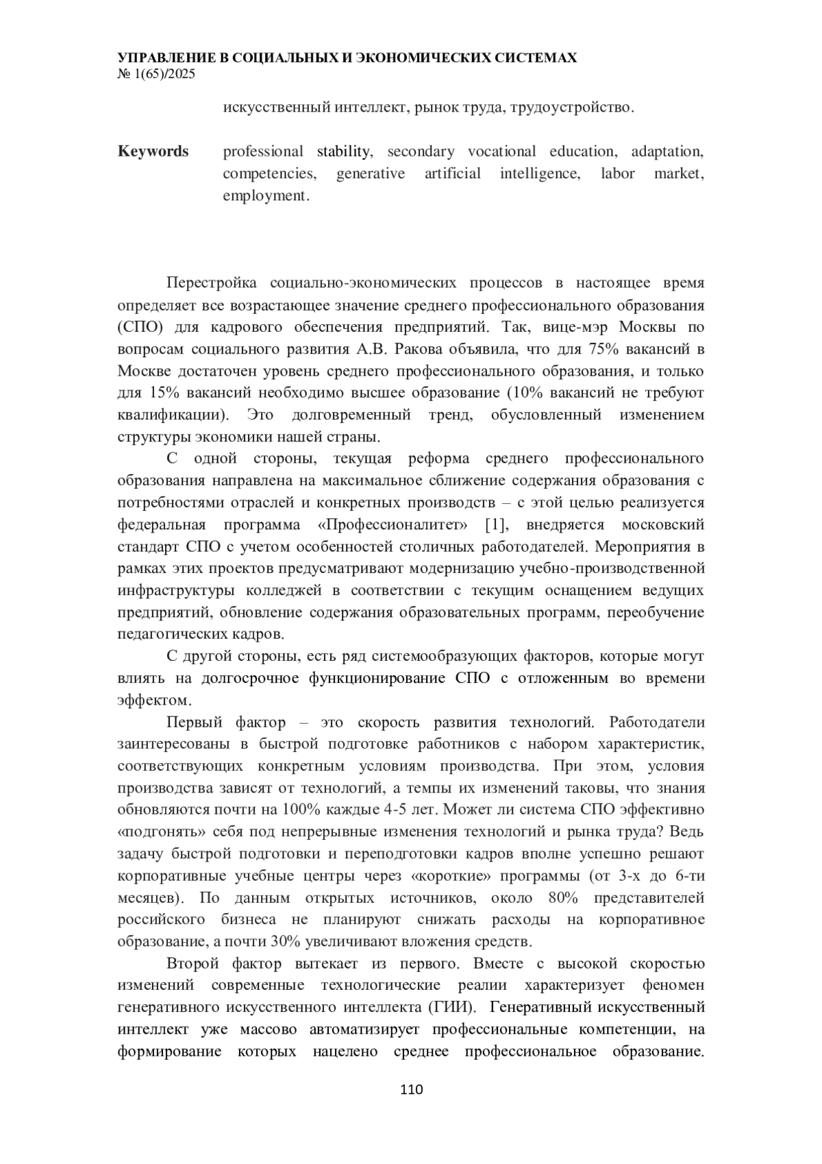 В статье рассматривается понятие профессиональной устойчивости как ключевой характеристики выпускника среднего профессионального образования (СПО) в условиях быстро меняющегося рынка труда и технологий. Автором выделены три основных фактора, воздействующие на подготовку кадров в долгосрочном контексте: скорость развития технологий, влияние генеративного искусственного интеллекта и необходимость воспитания личности будущего профессионала. В качестве решения предлагается смещение фокуса профессионального образования с формирования компетенций на развитие профессиональной устойчивости, что позволит выпускникам более эффективно адаптироваться к изменениям в профессиональной среде.