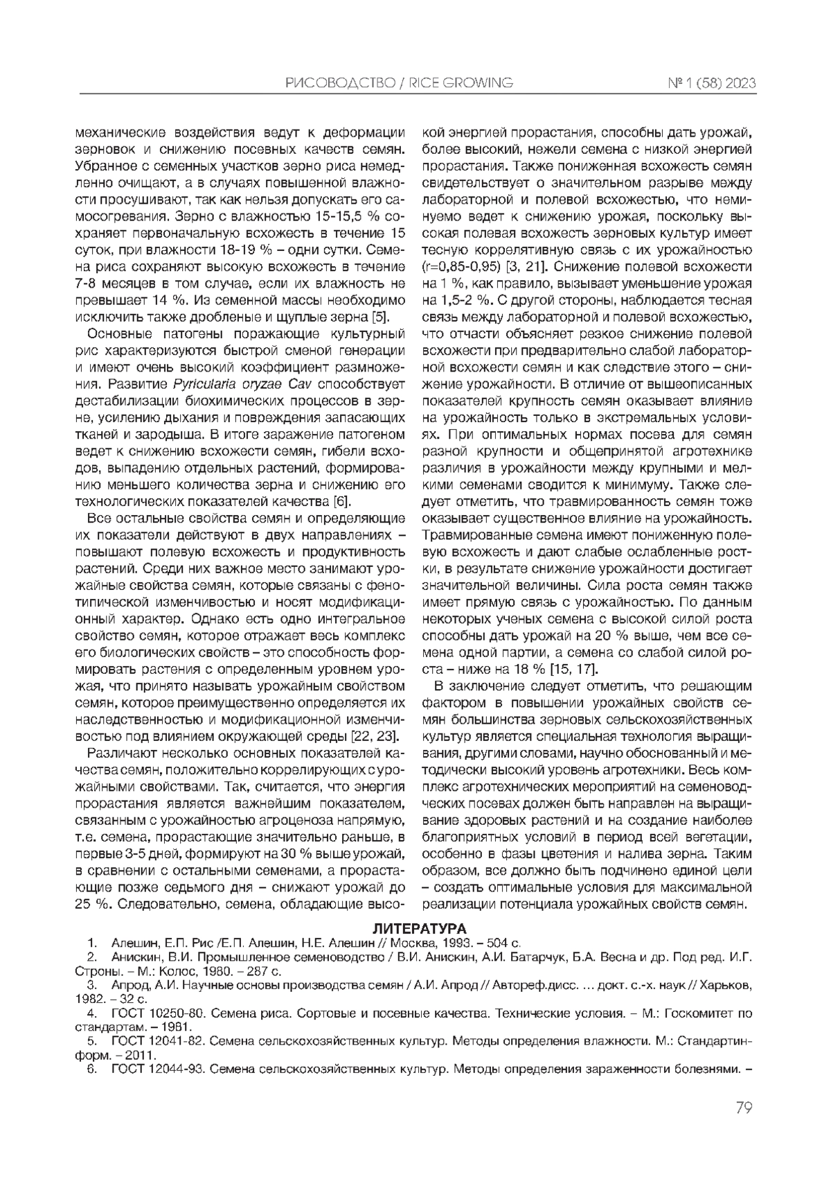 Рост урожайности сельскохозяйственных культур в процессе интенсификации земледелия происходит как благодаря улучшению условий их возделывания, в частности внесения повышенных доз элементов минерального питания, так и за счет использования новых, более продуктивных сортов. При внедрении в производство новых лучших сортов возрастает не только урожайность, но и увеличивается выход продукции и улучшается ее качество. Поэтому роль сорта как средства сельскохозяйственного производства в современном земледелии несомненно важна. Сорта сельскохозяйственных культур характеризуются определенной совокупностью полезных для человека свойств и качеств. Сохранение этих полезных качеств сорта в процессе массового размножения и производственного использования его семян и составляет одну из главных задач элитного семеноводства. Исследованиями предыдущих лет установлено постепенное ухудшение посевных качеств семян при длительном возделывании культуры риса в производственных условиях, что ведет к снижению урожайности и качества зерна и крупы. Связано это как с механическим засорением семян из-за низкого уровня агротехники, так и с биологическими изменениями сорта из-за вырождения семян, перекрестного опыления и т. д. В связи с этим исключительно важное значение имеет первичное и элитное семеноводство, т. е. организация и методические приемы выращивания семян элиты. Для выращивания высококондиционных семян элиты в системе современного семеноводства используются различные организационные формы, применяются разные методы и приемы. Контроль за посевными качествами семян осуществляется с помощью государственных, районных контрольно-семенных лабораторий, находящихся под ведомством краевых и республиканских лабораторий, методическое руководство которыми проводит Центральная контрольно-семенная лаборатория Министерства сельского хозяйства РФ. В связи с этим целью проведенного обзора является освещение основных факторов семеноводческой работы, влияющих на количество и качество получаемых семян риса.