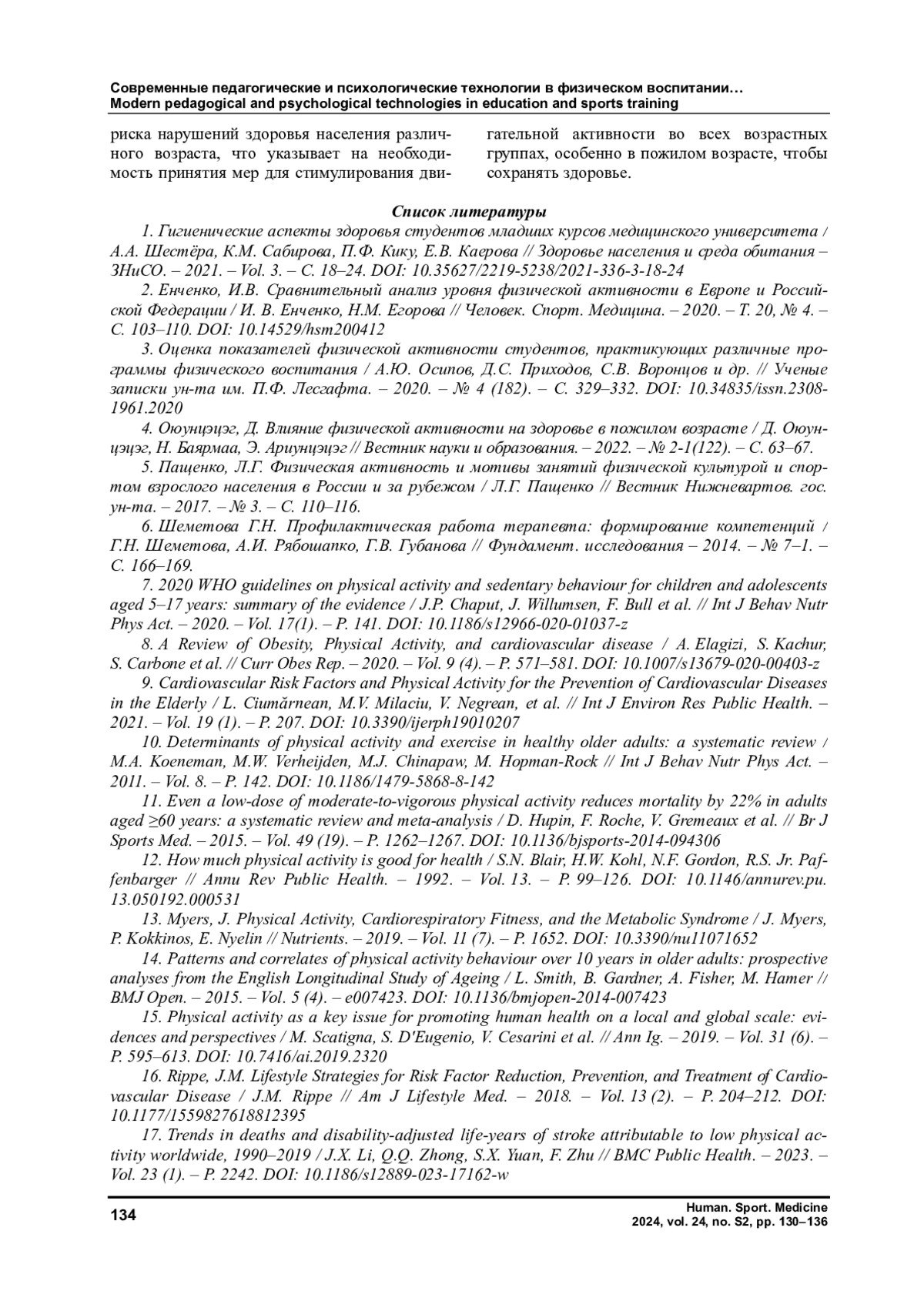2. Енченко, И.В. Сравнительный анализ уровня физической активности в Европе и Российской Федерации / И. В. Енченко, Н.М. Егорова // Человек. Спорт. Медицина. - 2020. - Т. 20, № 4. - С. 103-110. DOI: 10.14529/hsm200412 EDN: GZCPGN