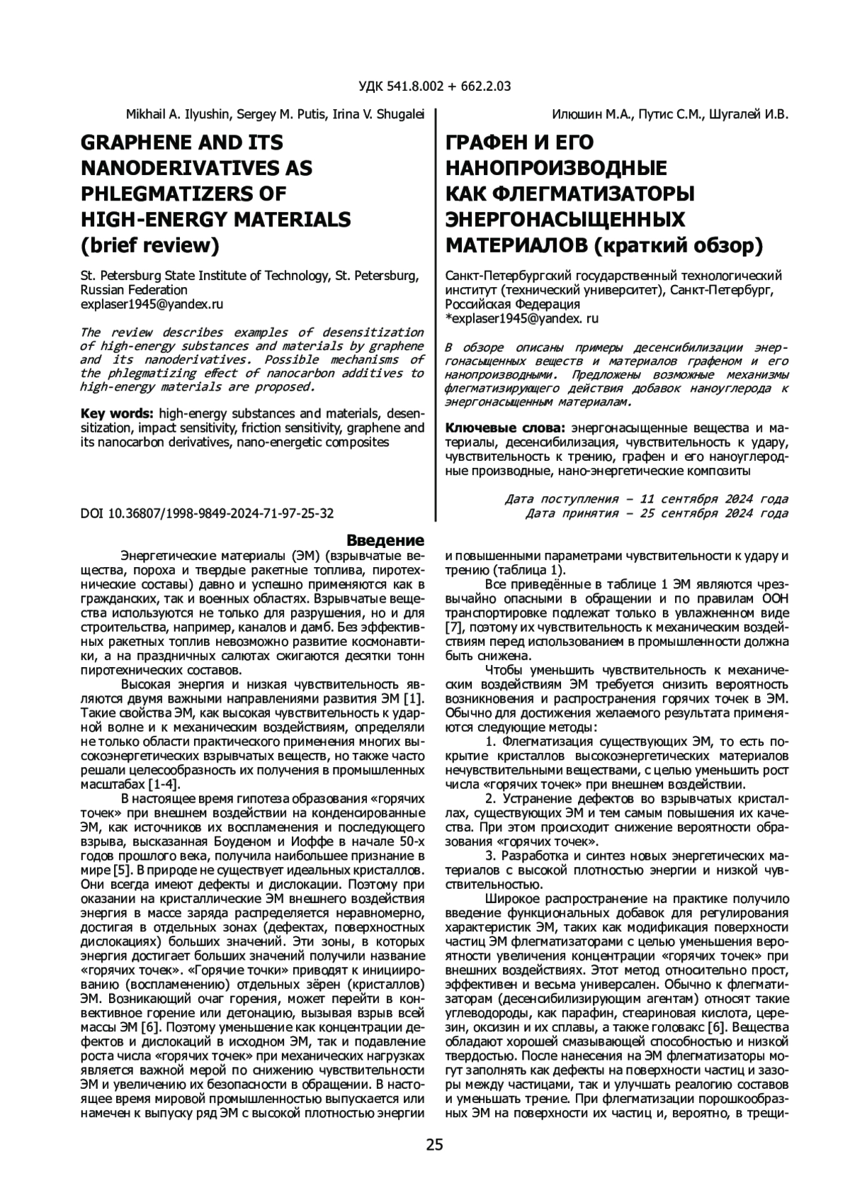 Статья: ГРАФЕН И ЕГО НАНОПРОИЗВОДНЫЕ КАК ФЛЕГМАТИЗАТОРЫ ЭНЕРГОНАСЫЩЕННЫХ МАТЕРИАЛОВ (краткий обзор) (2024)