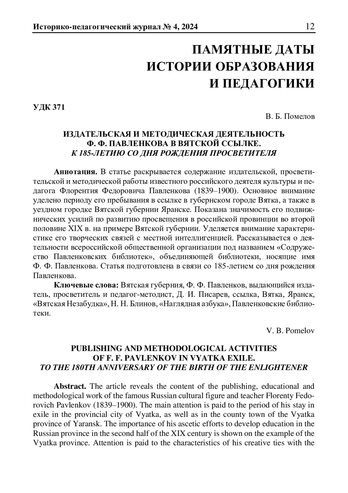 13. Помелов, В. Б. Просветитель и методист начальной школы Ф. Ф. Павленков. К 175-летию издателя, просветителя и педагога-методиста / В. Б. Помелов. - Текст: непосредственный // Начальная школа. 2014. - №10. - С. 4-11. EDN: TJYPCZ