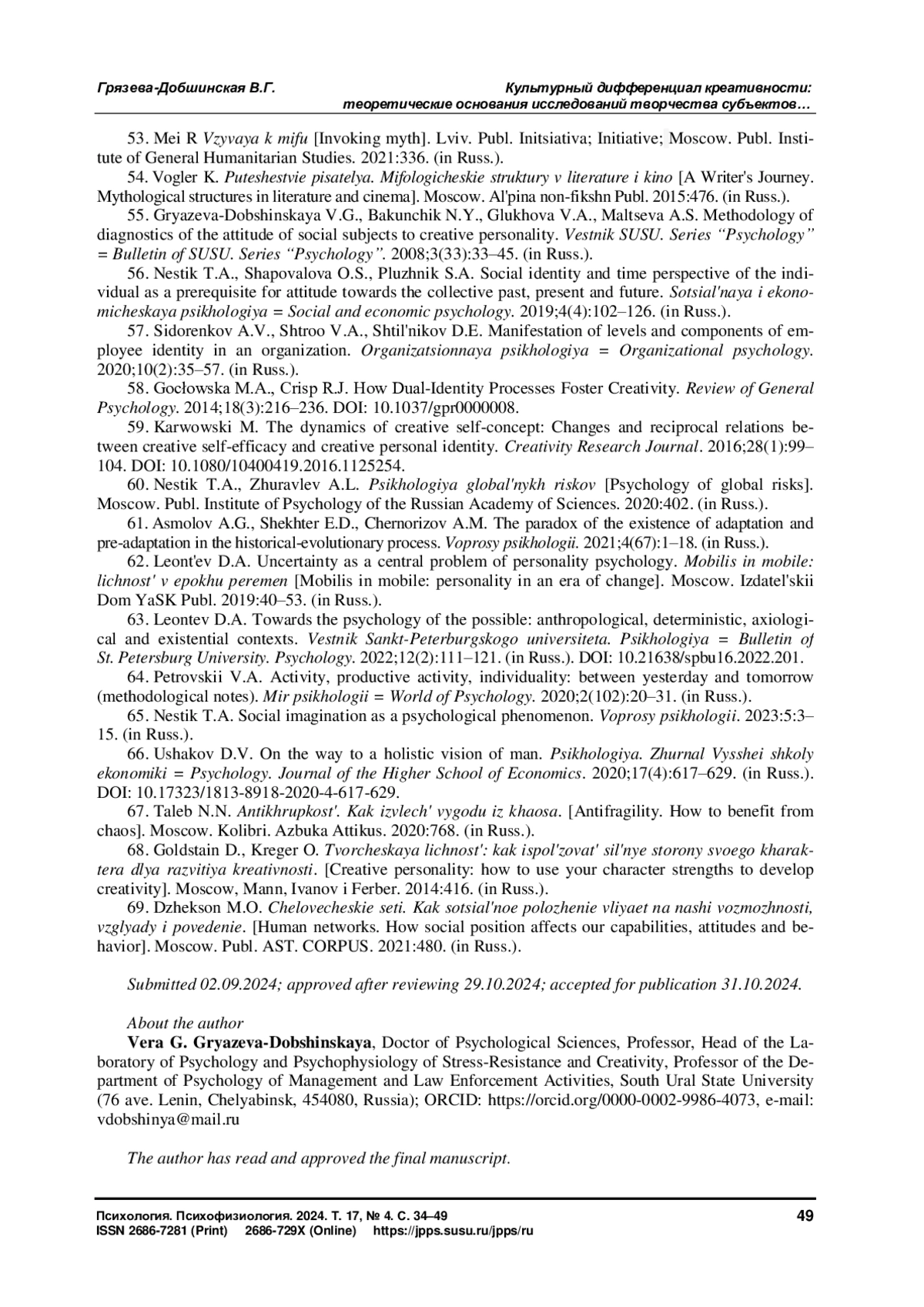 43. Гудзовская А.А., Добрынина Е.И., Мышкина М.С. Социальная идентичность как контекст креативности в ситуации фрустрации // Социальная психология и общество. 2023. Т. 14, № 2. C. 193-210. DOI: 10.17759/sps.2023140212 EDN: QGKMOY