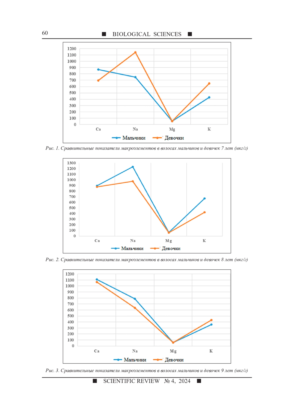 В данном исследовании определялись макроэлементы (кальций, натрий, магний и калий), а также микроэлементы (железо, цинк, медь, марганец, кобальт и бром) в волосах детей младшего школьного возраста (7–11 лет), проживающих в Самаркандской области, в зависимости от возраста и пола. В исследовании приняли участие 200 обучающихся младших классов, проживающих в различных биогеохимических районах Самаркандской области, было проанализировано состояние макро- и микроэлементов в волосах 100 девочек и 100 мальчиков. По результатам исследований анализ макро- и микроэлементов показал, что некоторые макрои микроэлементы различаются в зависимости от возраста и пола, в частности среди макроэлементов у детей 9 лет только содержание макроэлемента натрия отличалось убедительной разницей в волосах мальчиков и девочек (789±24,5 мкг/г и 637,8±141,1 мкг/г, р < 0,01). Возрастные различия по микроэлементам обнаруживаются по марганцу, который у девочек 10 лет ниже (p < 0,001), и по хрому, у девочек 7 и 11 лет он выше (p < 0,001). Причина этого может быть связана с рационом и биогеохимическими особенностями места проживания. Указанные показатели имеют значение для правильного определения количества макро- и микроэлементов в рационе детей 7–11 лет, проживающих в данном регионе. Также следует отметить, что подобные исследования проводятся впервые в этом регионе и полученные результаты могут быть рекомендованы как нормативные данные.