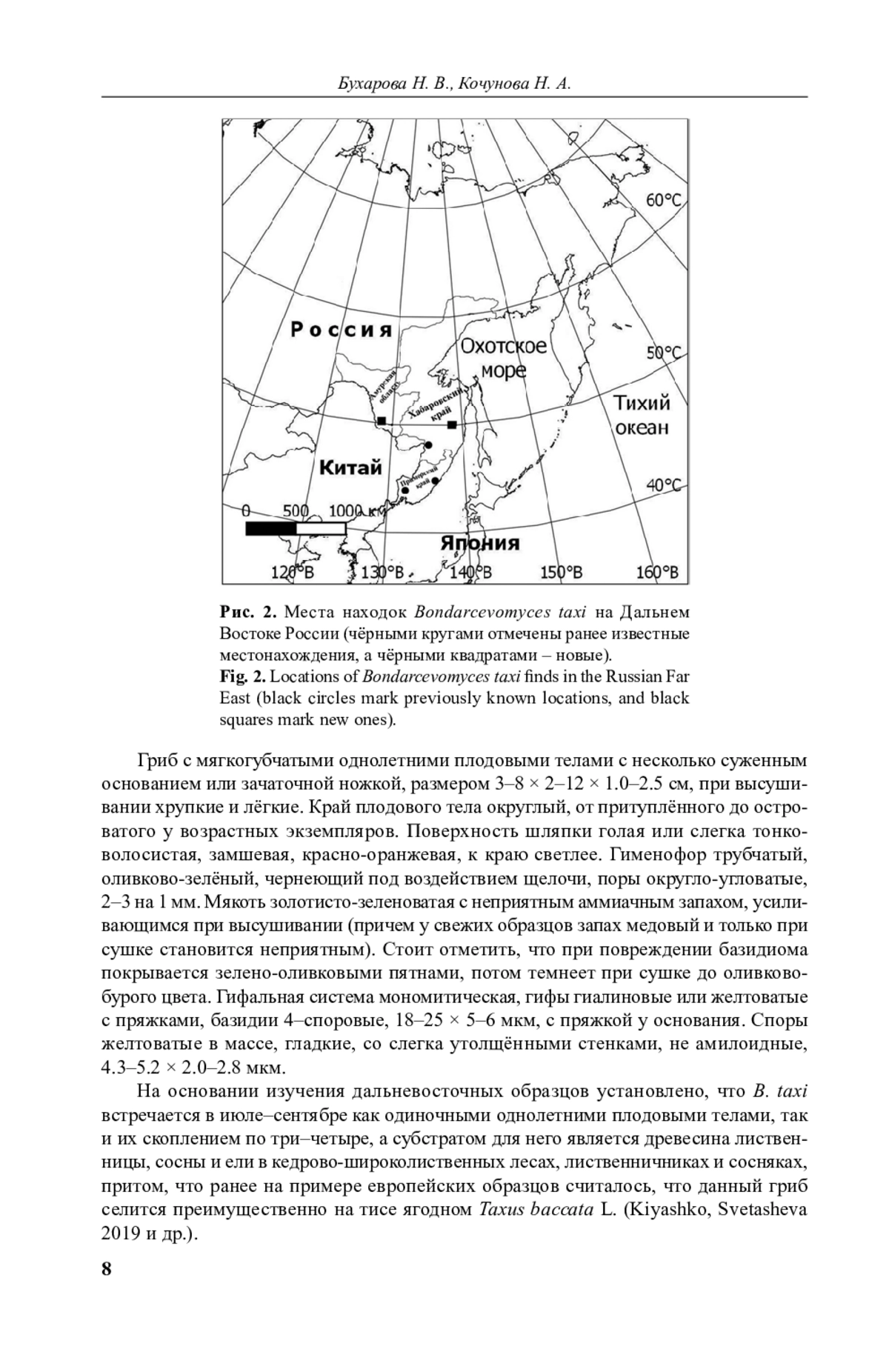Bondarcevomyces taxi (Bondartsev) Parmasto, русское название Бондарцевомицес тисовый – чрезвычайно редкий ксилотрофный гриб, известный в России из Краснодарского края, Новосибирской области, Хабаровского и Приморского краёв (Васильева 1939; Бондарцев 1940; Любарский, Васильева 1975; Бункина, Назарова 1978; Parmasto, Parmasto 1999; Vlasák et al. 2015; Красная книга Краснодарского края 2017; Kiyashko, Svetasheva 2019; Ерофеева и др. 2021). Вне России распространён в странах Восточной и Юго- Восточной Азии (Kiyashko, Svetasheva 2019; GBIF).