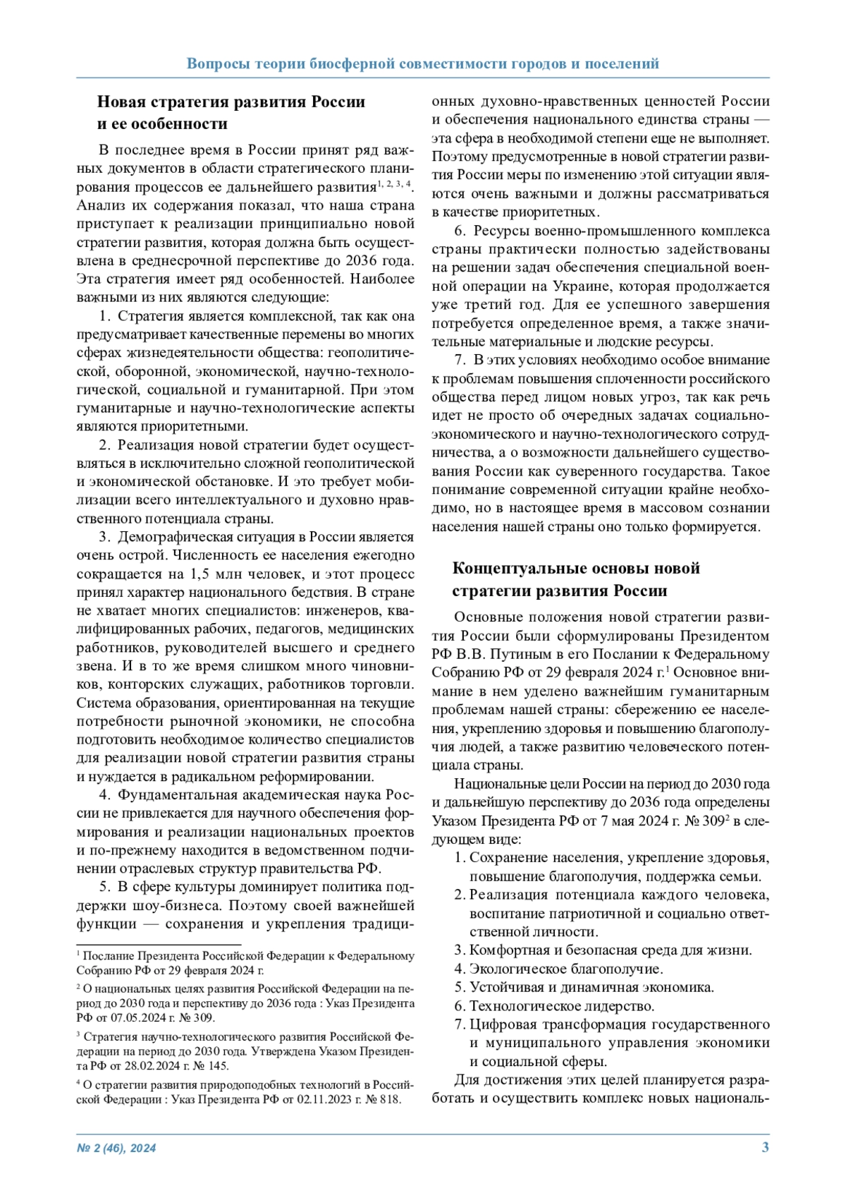 Проведен анализ основных направлений новой стратегии развития России и связанной с нею проблемы обеспечения биосферной совместимости человека и природы. Он показал, что наша страна приступает к реализации принципиально новой стратегии своего развития на долгосрочную перспективу. Ее осуществление будет иметь исключительно важное значение не только для нашей страны и ее союзников, но также и для всего мирового сообщества. Основной принцип этой стратегии состоит в том, чтобы обеспечить безопасность и будущее нашей страны на основе ее многоаспектного развития. При этом результатом планируемых глубоких и масштабных преобразований практически всех сфер жизнедеятельности российского общества должно стать решение демографических проблем России и развитие ее человеческого потенциала. Это станет основой для повышения качества жизни населения и обеспечения национальной безопасности страны, ее государственного и технологического суверенитета. Однако при этом необходимо учитывать и глобальные угрозы, обусловленные техногенной деятельностью человека. Понимание этих угроз и определение адекватных мер противодействия им требуют формирования нового мировоззрения интеллектуальной элиты общества, а также изменения концепции развития цивилизации, создания и широкого использования природоподобных технологий. С учетом этого сформулированы предложения по совершенствованию системы государственного управления научно-технологическим развитием страны и показана необходимость междисциплинарных исследований для получения новых знаний и создания эффективных технологий на основе имеющихся в России результатов поисковых работ в этой области