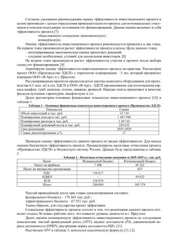 Исследованы теоретические основы эффективности проектов и ее виды, оценки эффективности инвестиционных проектов, а также факторы, влияющие на эффективность проекта. При исследовании инвестиционного проекта необходимо тщательно проанализировать рыночное положение компании, рынок сбыта, потенциального покупателя, на основе стратегии развития или инвестиционного плана проекта. Потенциальному инвестору необходимо показать примерные сроки реализации, просчитать точку безубыточности и попытаться снизить степень будущей неопределенности, для более эффективного привлечения длинных денег на нужды проекта. Для инвестора инвестиционный проект эффективен, если эффект от его внедрения будет положительным, а при сравнении альтернативных инвестиционных проектов предпочтение отдаётся проекту с наилучшим результатом. В статье проведена практическая апробация оценки эффективности инвестиционного проекта «Производства ЛДСП» для компании по производству мебели «Я-Арт» г. Иркутск. Оценка различных видов эффективности данного проекта подтвердила его жизнеспособность и привлекательность для инвесторов, но вместе с тем показала проблемные места, на которые необходимо обратить особое внимание.