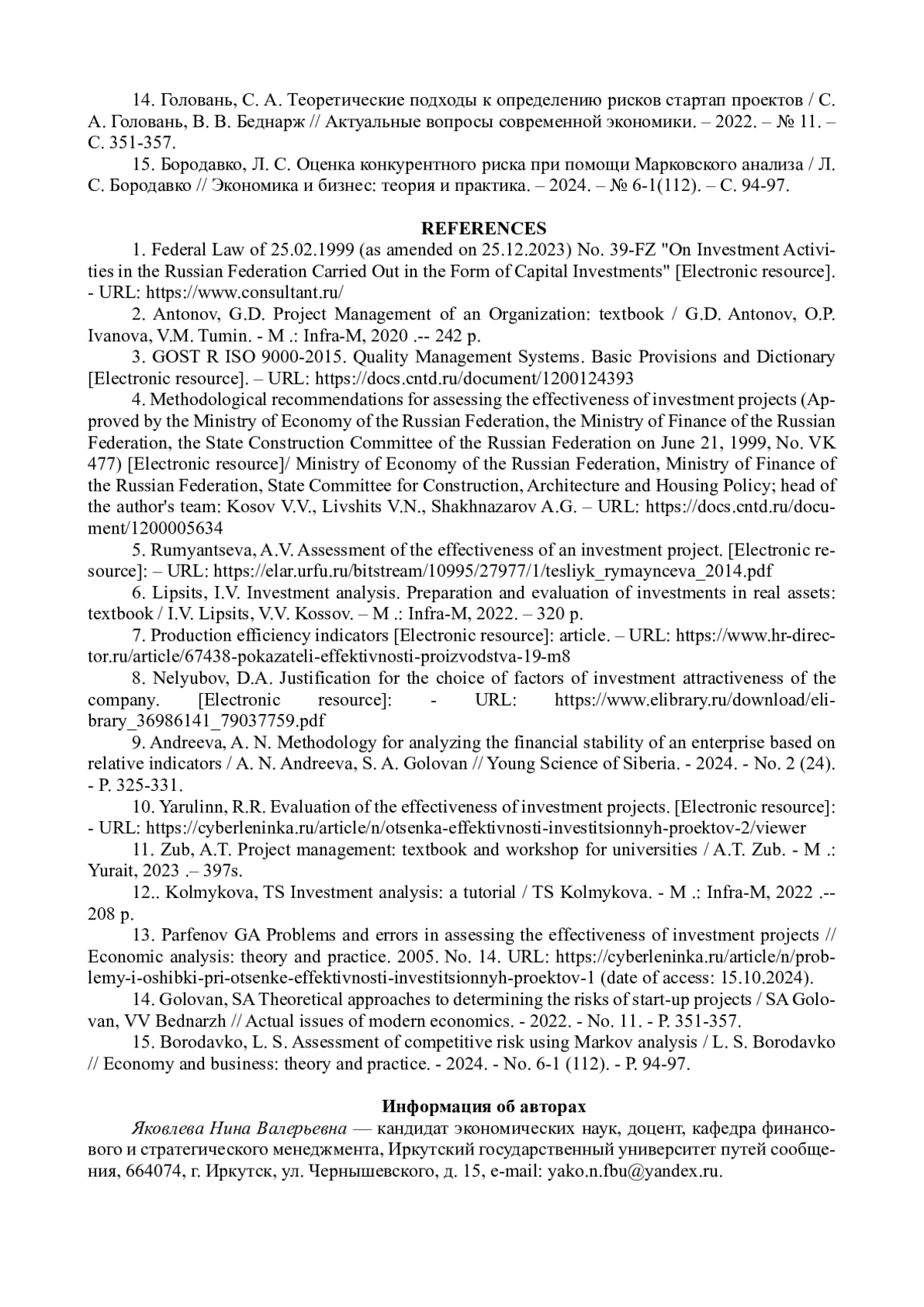 - Парфенов Г.А. Проблемы и ошибки при оценке эффективности инвестиционных проектов// Экономический анализ: теория и практика. 2005. №14. URL: https://cyberleninka.ru/article/n/problemy-i-oshibki-pri-otsenke-effektivnosti-investitsionnyh-proektov-1 (дата обращения: 15.10.2024).