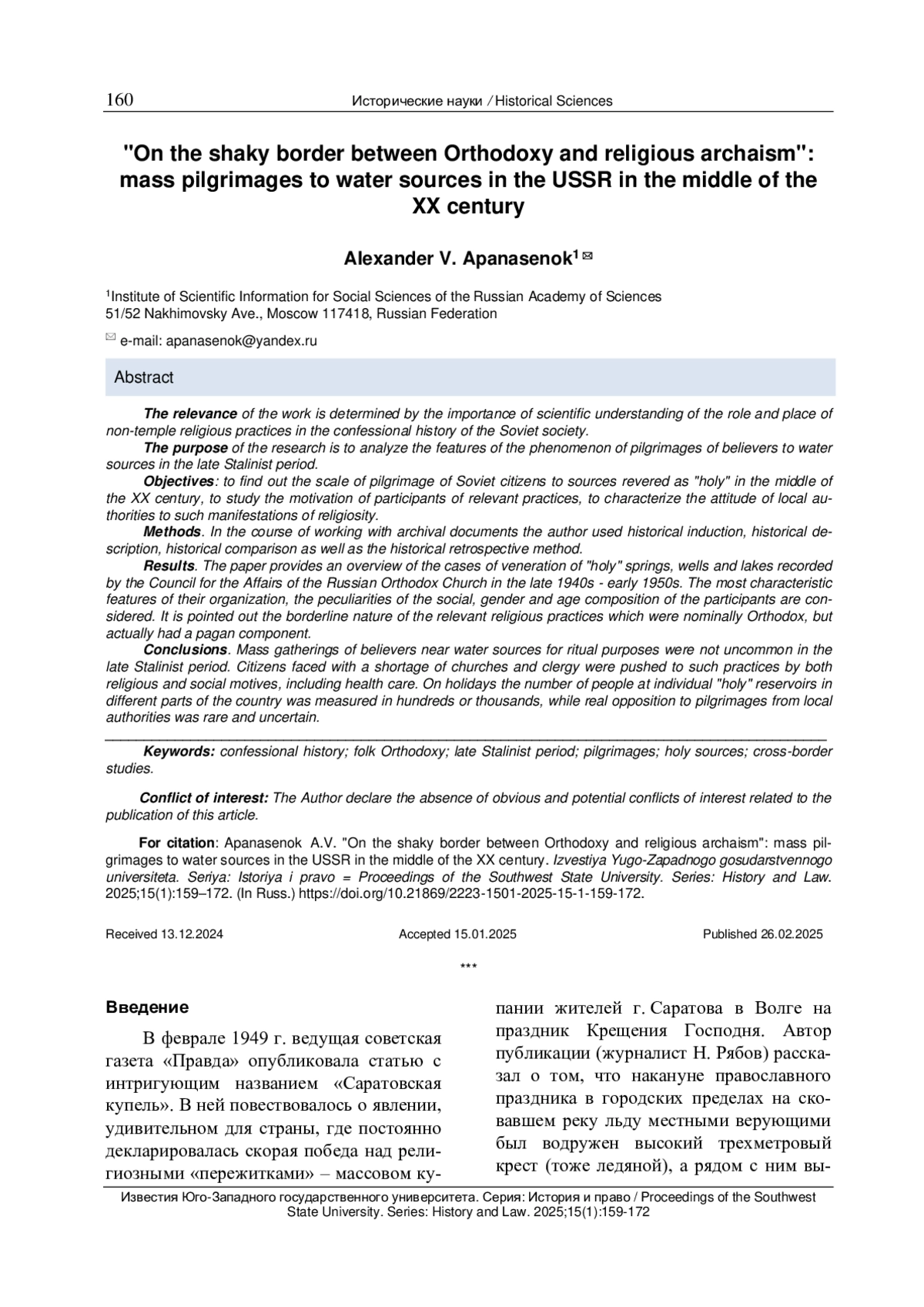 16. Апанасенок А.В. Верующие колхозники и «попы-коммунисты»: к вопросу о сосуществовании православной и «социалистической» культур в жизни советского села позднесталинского и хрущевского периодов // Новейшая история России. 2022. Т.12, № 4. С.1018-1034.