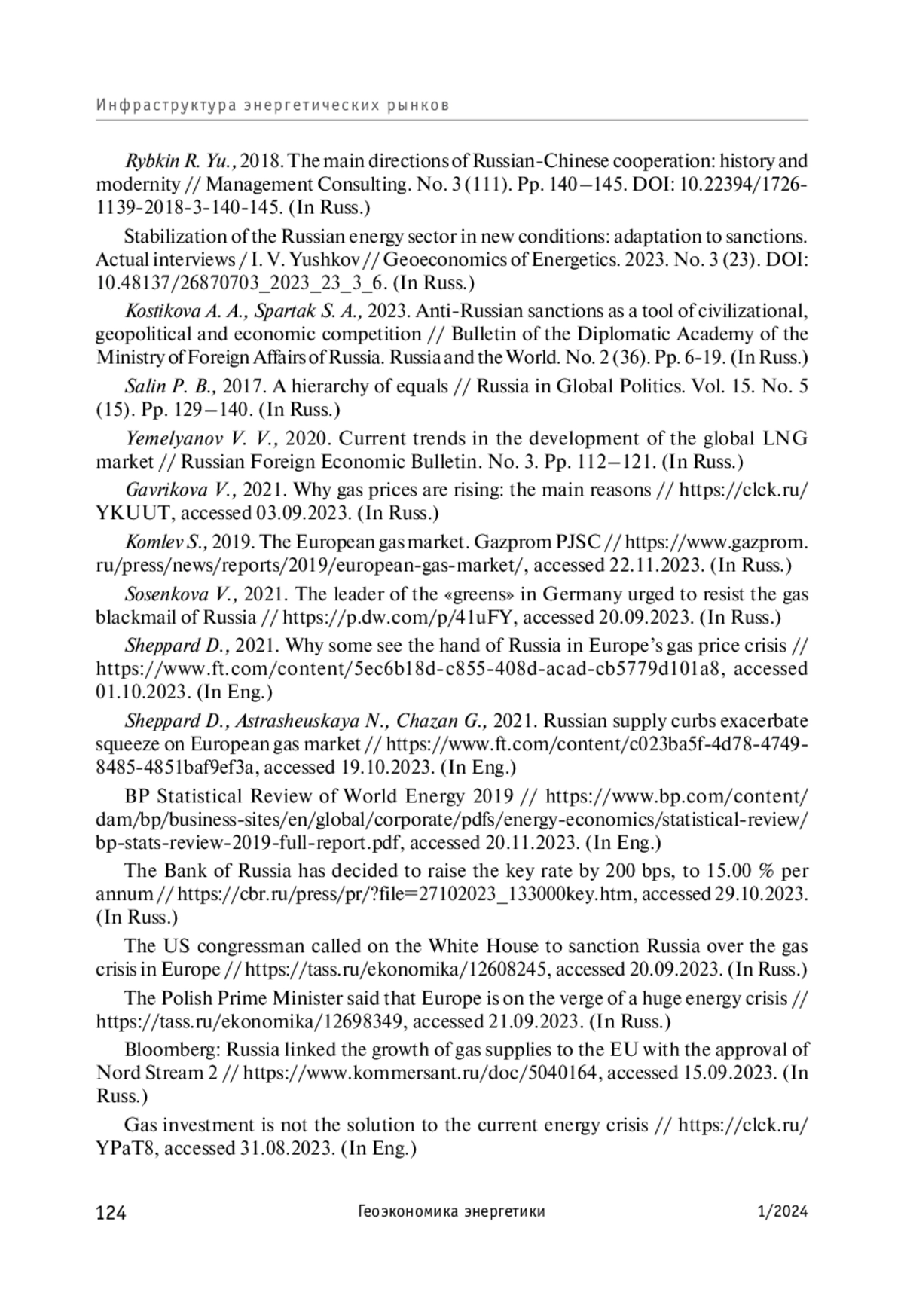 12. Sheppard D., Astrasheuskaya N., Chazan G., 2021. Russian supply curbs exacerbate squeeze on European gas market // https://www.ft.com/content/c023ba5f-4d78-4749-8485-4851baf9ef3a, дата обращения 19.10.2023.