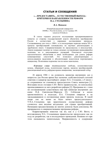 26 апреля 1906 г. на должность министра внутренних дел в непростое для России время был назначен «действительный статский советник и камергер высочайшего двора» П. А. Столыпин, а 8 июля с ее сохранением он становится председателем Совета министров [1]. Возглавив после отставки С. Ю. Витте правительство, он использовал производившиеся до него разработки реформ [2]. Программа их с теми же составляющими существовала еще при министре внутренних дел князе П. Д. Святополке-Мирском [3]. Соблюдая в целом преемственность в подходах, П. А. Столыпин опирался и на закладывавшиеся в составленные ранее проекты подходы. В такой опоре тем не менее не было ничего предосудительного. У П. А. Столыпина при практическом осуществлении реформ сложилось свое видение актуальных для страны преобразований. Начинания предшественника во многих аспектах были дополнены. Не прекращалось и совершенствование программы реформ.