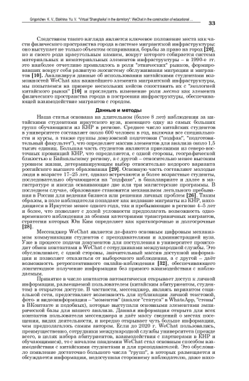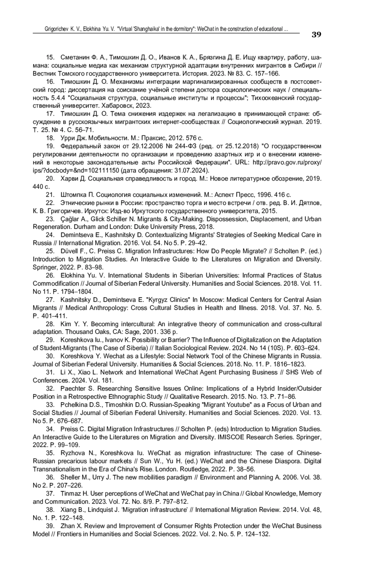 30. Koreshkova Y. Wechat as a Lifestyle: Social Network Tool of the Chinese Migrants in Russia. Journal of Siberian Federal University. Humanities & Social Sciences. 2018. No. 11. P. 1816-1823. EDN: YOLAEX