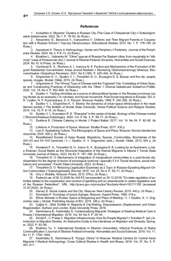 1. Авдашкин А. А. Мигрантские кластеры в российском городе (на примере Челябинска) // Социологические исследования. 2022. № 1. С. 76-83. EDN: THPHUJ