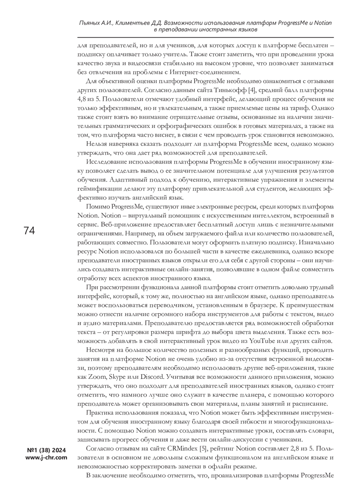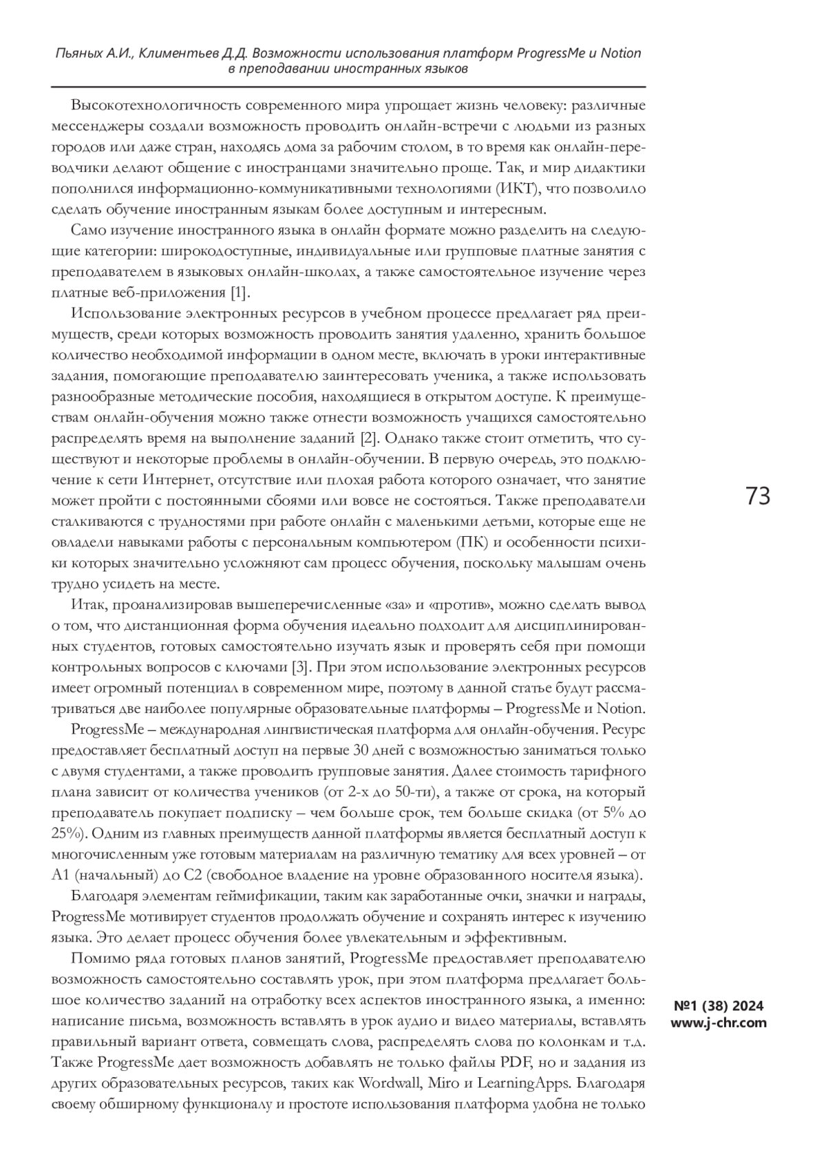 В статье авторы предлагают подробный обзор образовательных платформ ProgressMe и Notion для преподавания иностранных языков, в частности, основные преимущества и недостатки их использования в учебном процессе. Исследование представляет практические рекомендации по интеграции этих платформ в учебный процесс с целью повышения мотивации студентов и качества обучения.