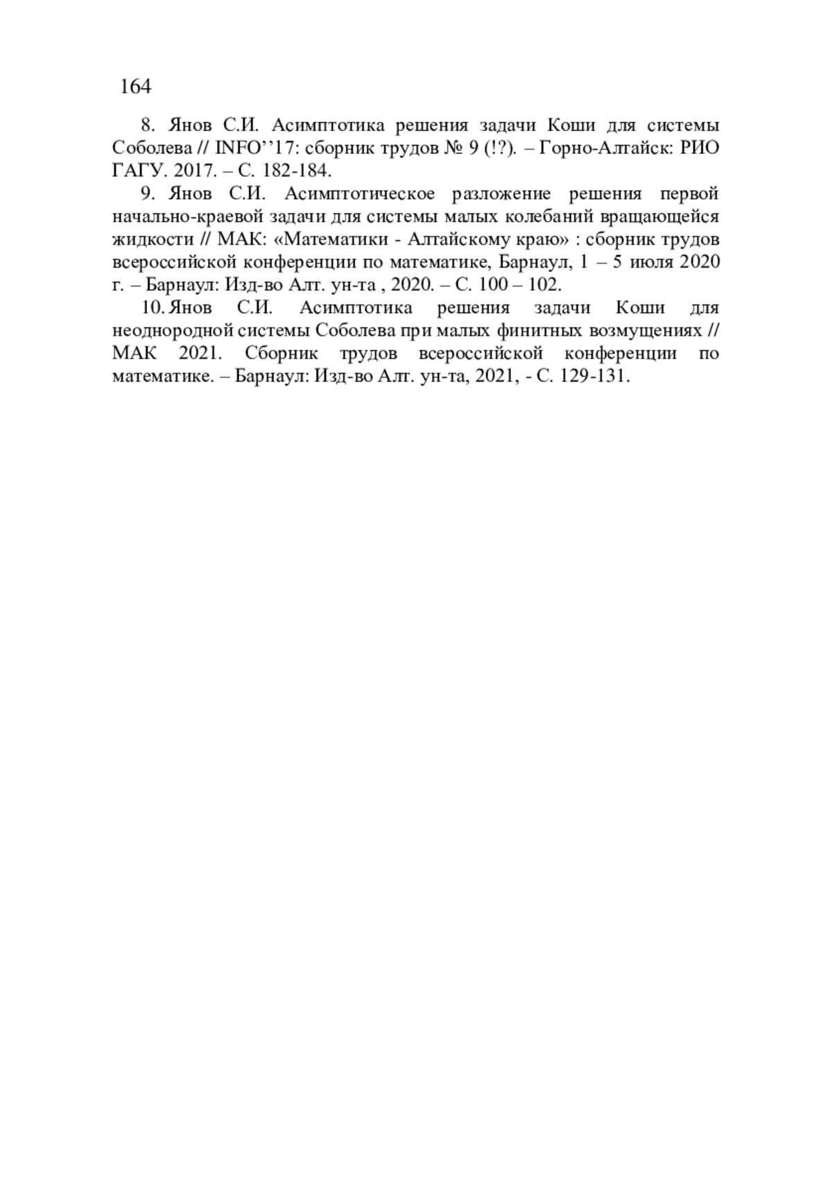 10. Янов С.И. Асимптотика решения задачи Коши для неоднородной системы Соболева при малых финитных возмущениях // МАК 2021. Сборник трудов всероссийской конференции по математике. - Барнаул: Изд-во Алт. ун-та, 2021, - С. 129-131.