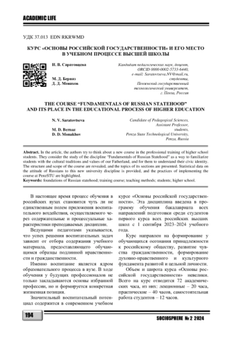 В статье авторы пытаются осмыслить новый курс в профессиональной подготовке студентов высшей школы. Они рассматривают изучение дисциплины “Основы российской государственности” как способ ознакомления студентов с культурными традициями и ценностями нашего Отечества, а также для осознания ими своей гражданской идентичности. Раскрываются структура и объем курса, а также представлены темы его разделов. Приводятся статистические данные об отношении россиян к этой новой университетской дисциплине и освещается практика внедрения курса в ПензГТУ.