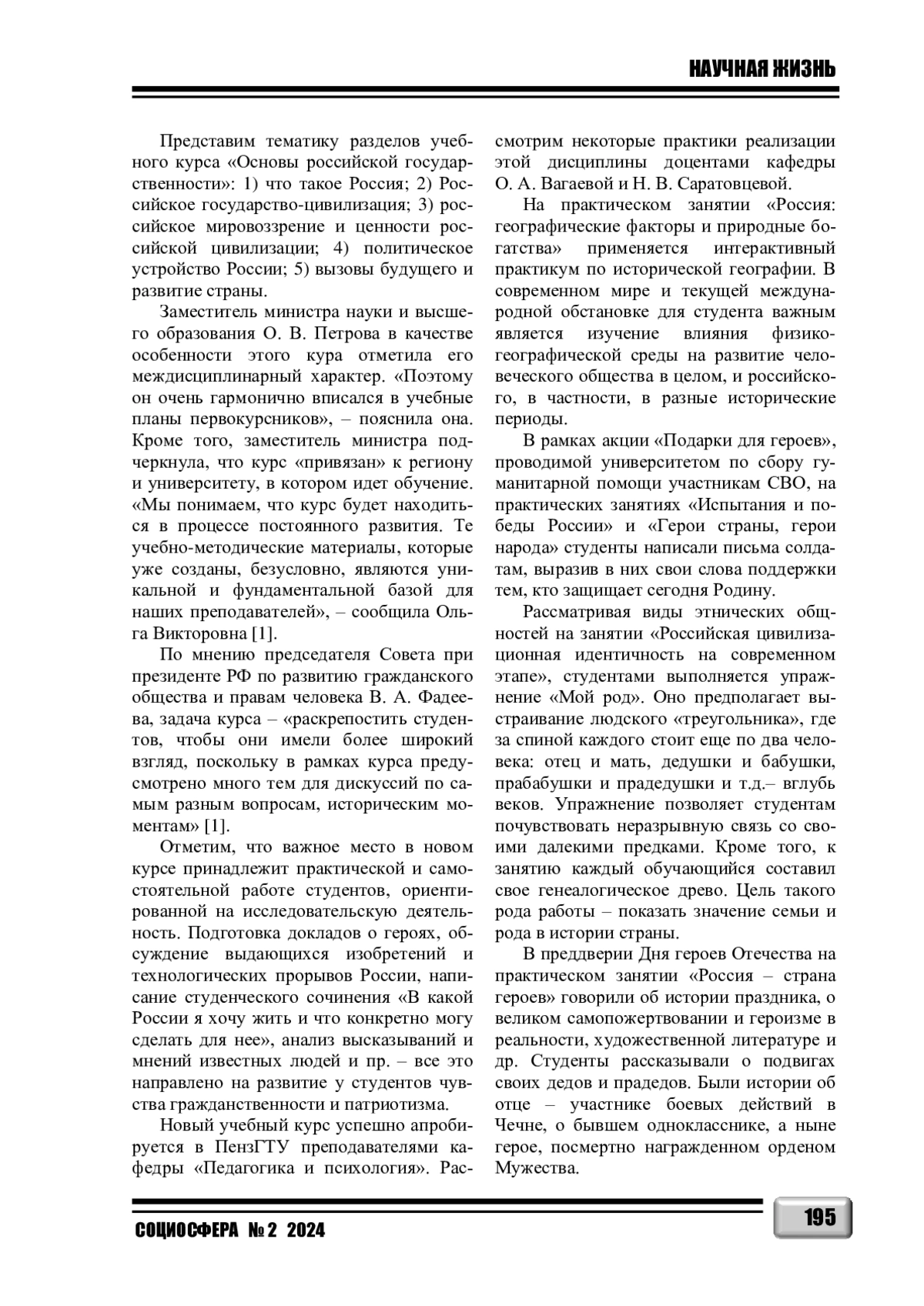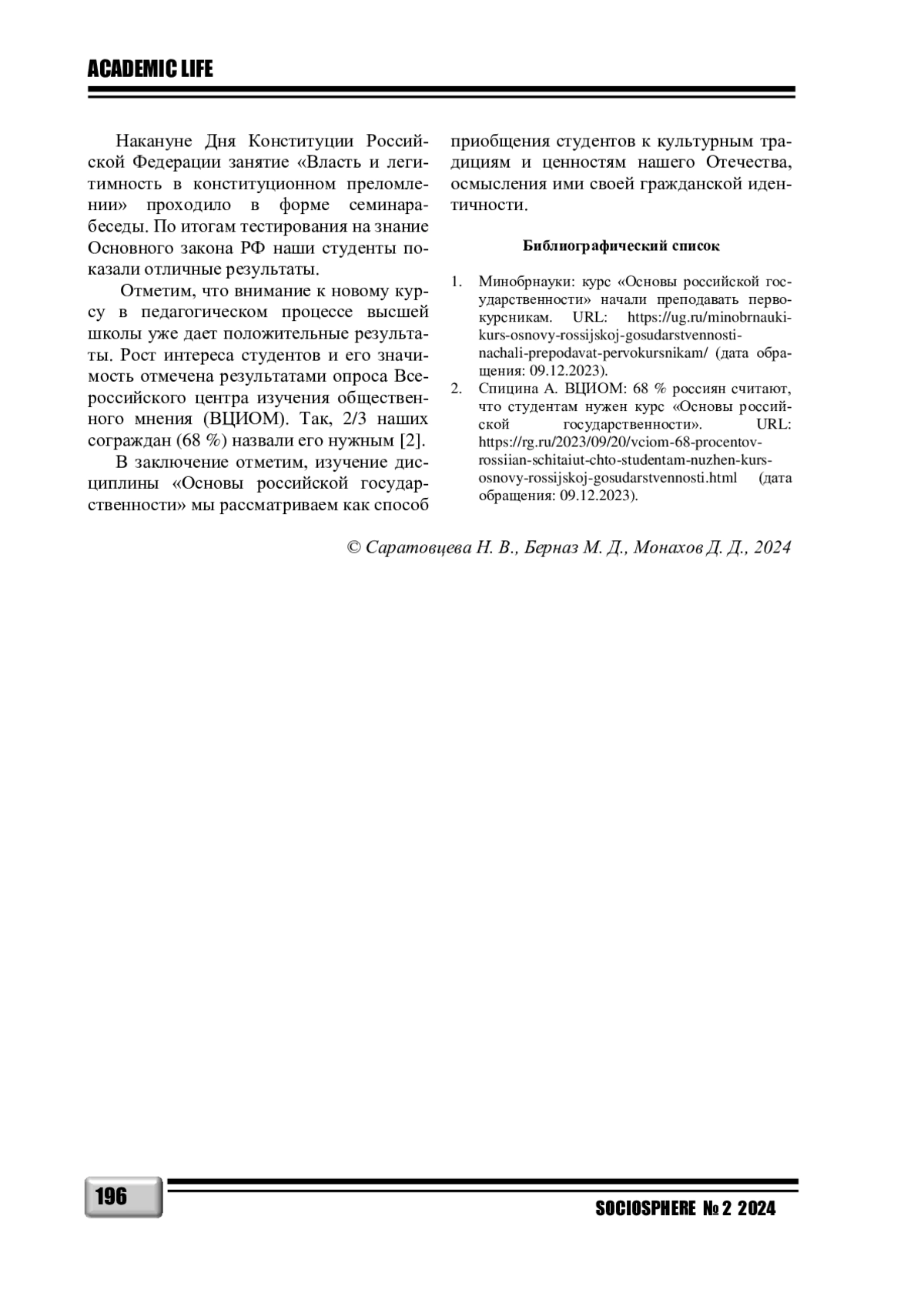 2. Спицина А. ВЦИОМ: 68 % россиян считают, что студентам нужен курс “Основы российской государственности”. URL: https://rg.ru/2023/09/20/vciom-68-procentov-rossiian-schitaiut-chto-studentam-nuzhen-kurs-osnovy-rossijskoj-gosudarstvennosti.html (дата обращения: 09.12.2023).