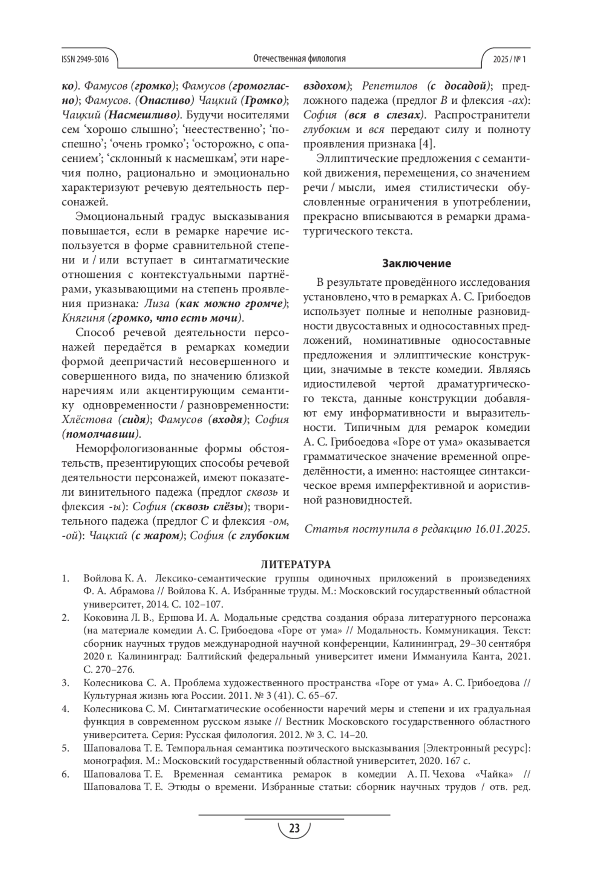 2. Коковина Л. В., Ершова И. А. Модальные средства создания образа литературного персонажа (на материале комедии А. С. Грибоедова «Горе от ума» // Модальность. Коммуникация. Текст: сборник научных трудов международной научной конференции, Калининград, 29-30 сентября 2020 г. Калининград: Балтийский федеральный университет имени Иммануила Канта, 2021. С. 270-276.