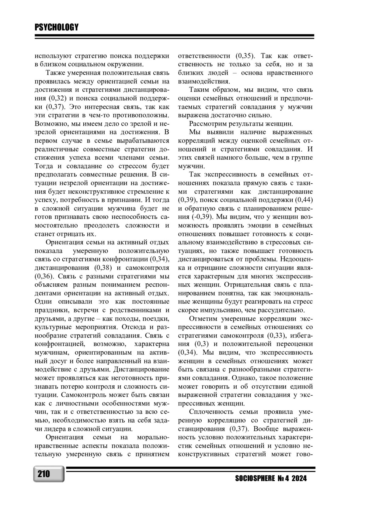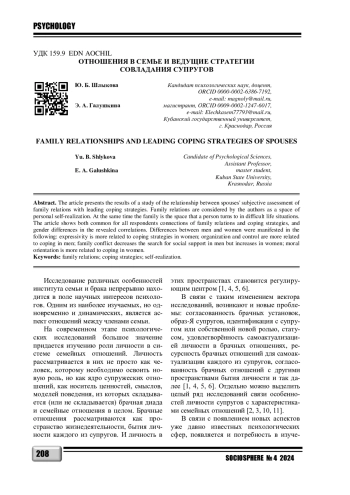 В статье представлены результаты исследования взаимосвязи субъективной оценки супругами семейных отношений с ведущими копинг-стратегиями. Семейные отношения рассматриваются авторами как пространство личностной самореализации. В то же время семья - это пространство, к которому человек обращается в трудных жизненных ситуациях. В статье показаны как общие для всех респондентов связи семейных отношений и копинг-стратегий, так и гендерные различия в выявленных корреляциях. Различия между мужчинами и женщинами проявлялись в следующем: экспрессивность в большей степени связана со стратегиями совладания у женщин; организованность и контроль в большей степени связаны с совладанием у мужчин; семейные конфликты снижают потребность в социальной поддержке у мужчин, но увеличивают у женщин; моральная ориентация в большей степени связана с совладанием у женщин.