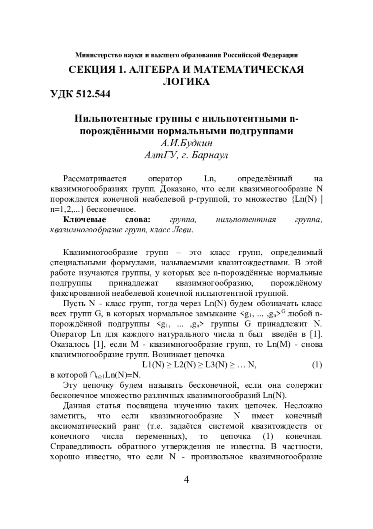 2. Будкин А.И., Таранина Л.В. О квазимногообразиях Леви, порождённых нильпотентными группами // Сиб. мат. журн. - 2000. - Т.41, №2. - С. 270-277. EDN: YVKCCP