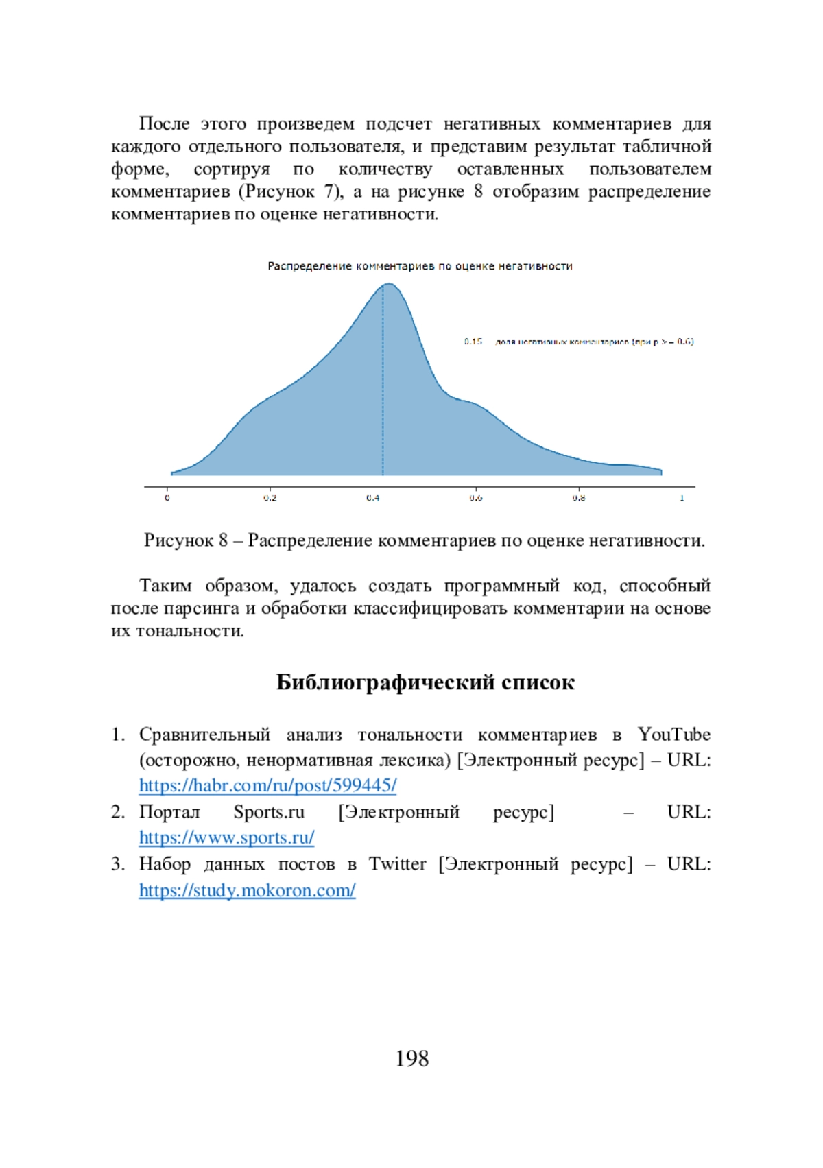 Статья посвящена классификации и анализу тональности комментариев к посту на портале sports. ru. Сначала выполнялся парсинг этих комментариев, а затем проводился анализ тональности комментариев, результаты которого визуализированы с помощью графика распределения комментариев.