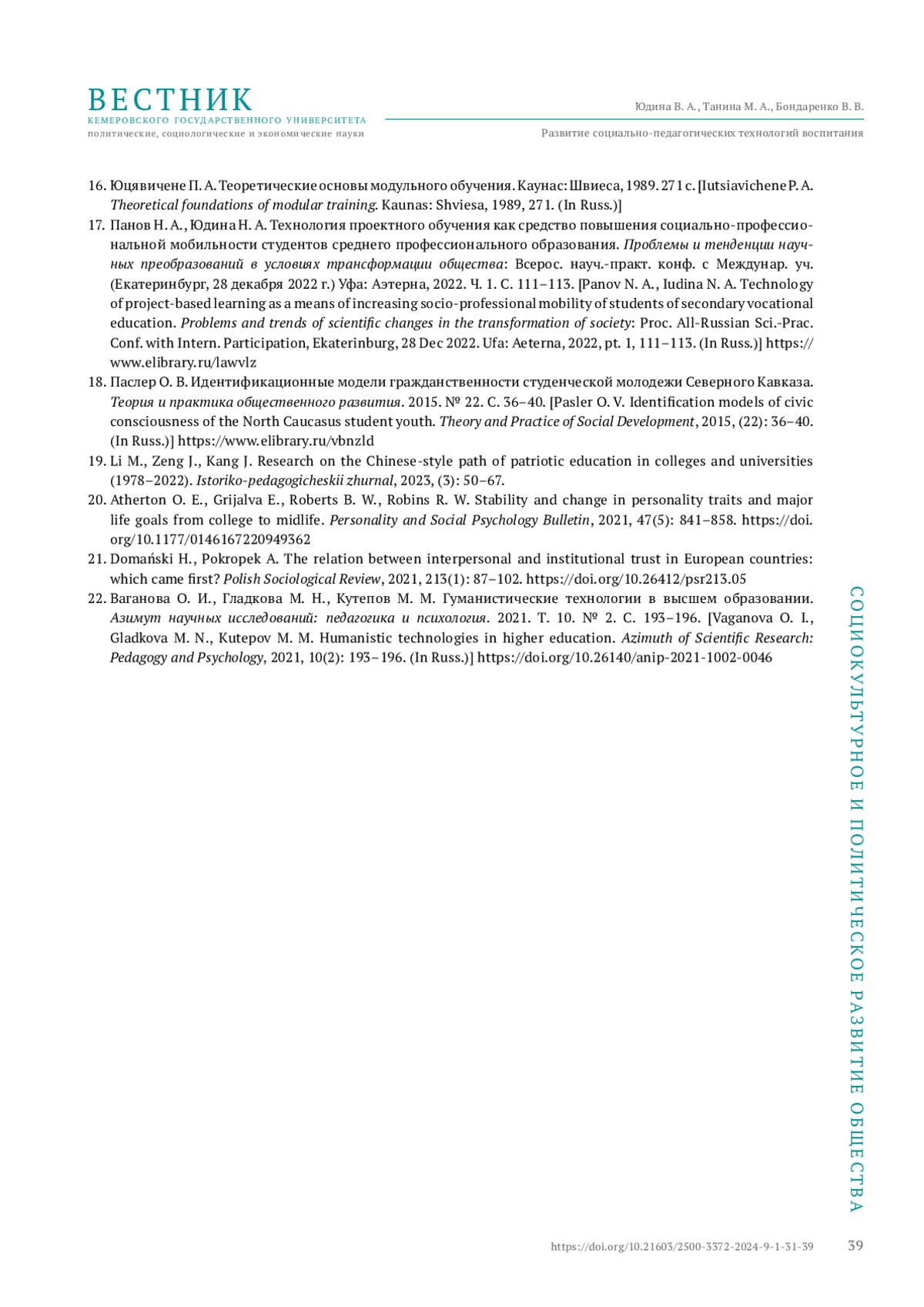 8. Тюрина Ю. А., Горькавый М. А., Зиновьева Е. А., Надорожная М. В., Ким А. Ч. Социально-педагогические технологии в реализации молодежной политики в вузе: на примере грантовых проектов агентства Росмолодежи. Социальные и гуманитарные науки на Дальнем Востоке. 2020. Т. 17. № 2. С. 94-106. DOI: 10.31079/1992-2868-2020-17-2-94-106 EDN: YHNGZI