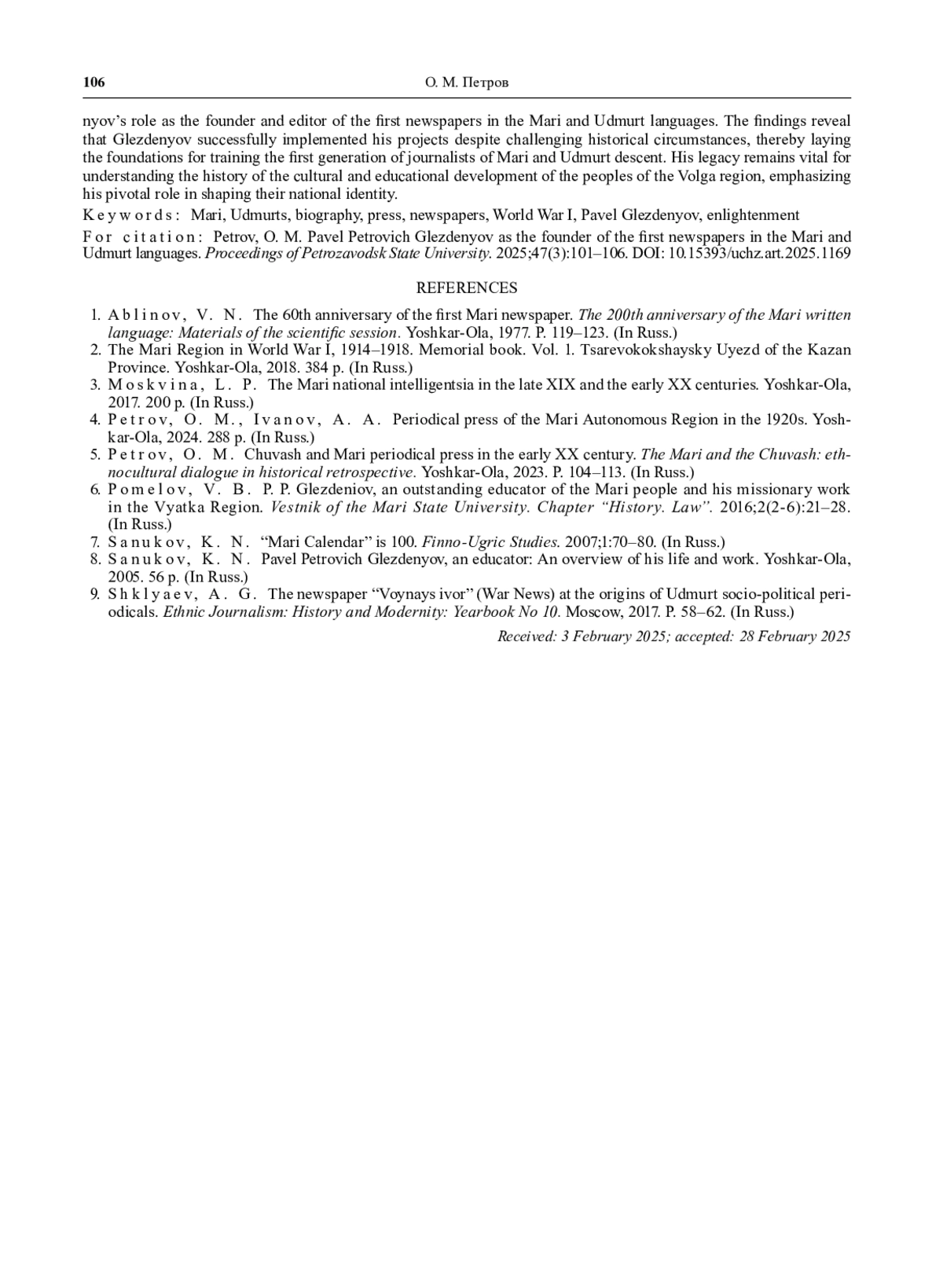 5. Петров О. М. Чувашская и марийская периодическая печать в начале XX в. // Мари и чуваши: этнокультурный диалог в исторической ретроспективе. Йошкар-Ола, 2023. С. 104-113.
